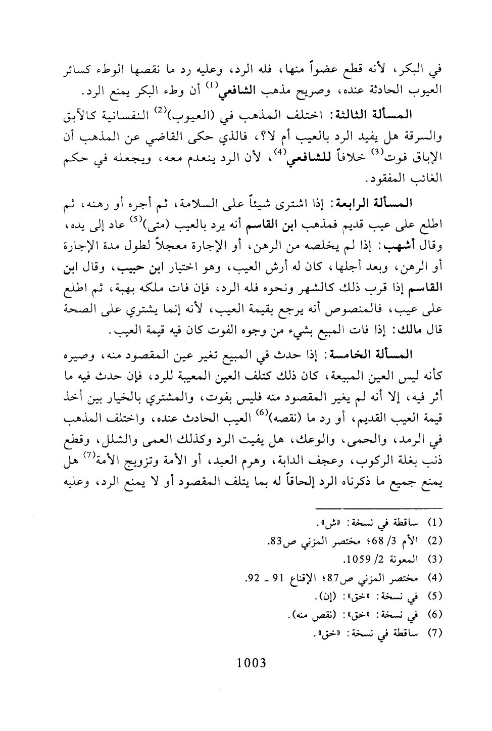 المسألة الخامسة: إذا حدث في المبيع تغير عين المقصود منه، وصيره كأنه ليس العين المبيعة، كان ذلك كتلف العين المعيبة للرد، فإن حدث فيه ما أثر فيه، إلا أنه لم يغير المقصود منه فليس بفوت، والمشتري بالخيار بين أخذ قيمة العيب القديم، أو رد ما (نقصه) العيب الحادث عنده، واختلف المذهب فيب الرمد، والحمى، والوعك، هل يفيت الرد وكذلك العمى والشلل، وقطع ذنب بغلة الركوب، وعجف الدابة، وهرم العبد، أو الأمة وتزويج الأمة هل يمنع جميع ما ذكرناه الرد إلحاقاً له بما يتلف المقصود أو لا يمنع الرد، وعليه