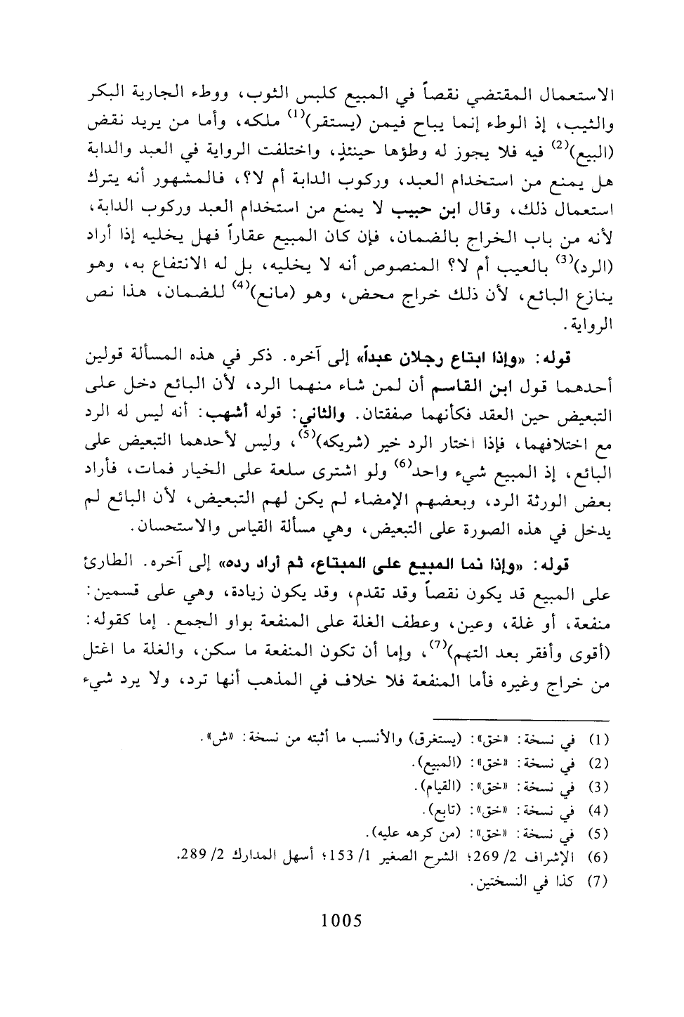 الاستعمال المقتضي نقصًا في المبيع كلبس الثوب، ووطء الجارية البكر والثيب، إذ الوطء إنما يباح فيمن (يستقر) ملكه، وأما من يريد نقض (البيع) فيه فلا يجوز له وطؤها حينيذٍ، واختلفت الرواية في العبد والدابة هل يمنع من استخدام العبد، وركوب الدابة أم لا؟، فالمشهور أنه يترك استعمال ذلك، وقال ابن حبيب لا يمنع من استخدام العبد وركوب الدابة، لأنه من باب الخراج بالضمان، فإن كان المبيع عقارًا فهل يخليه إذا أراد (الرد) بالعيب أم لا؟ المنصوص أنه لا يخليه، بل له الانتفاع به، وهو ينازع البائع، لأن ذلك خراج محض، وهو (مانع) للضمان، هذا نص الرواية.