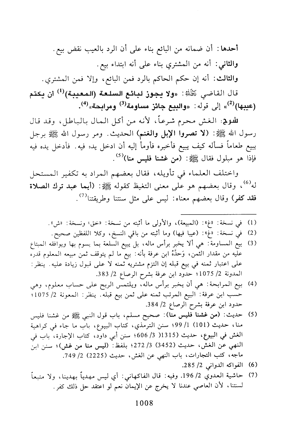 قال القاضي -رحمه الله-: "ولا يجوز لبائع السلعة (المعيبة) أن يكتم (عيبها) " إلى قوله: "والبيع جائز مساومةً ومرابحةً".