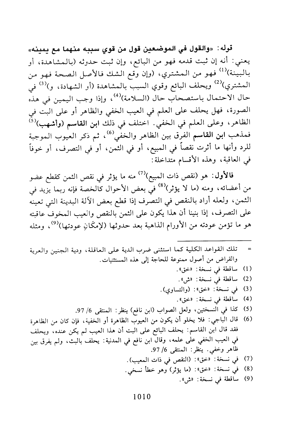 قوله: "والقول في الموضعين قول من قوي سببه منهما مع يمينه" يعني: أنه إن ثبت قدمه فهو من البائع، وإن ثبت حدوثه (بالمشاهدة، أو بالبينة) فهو من المشتري، (وإن وقع الشك فالأصل الصحة فهو من المشتري) ويحلف البائع وقوي السبب بالمشاهدة (أو الشهادة، و) في حال الاحتمال باستصحاب حال (السلامة)، وإذا وجب اليمين في هذه الصورة، فهل يحلف على العلم في العيب الخفي والظاهر أو على البت في الظاهر، وعلى العلم في الخفي. اختلف في ذلك ابن القاسم (وأشهب) فمذهب ابن القاسم الفرق بين الظاهر والخفي، ثم ذكر العيوب الموجبة للرد وأنها ما أثرت نقصًا في المبيع، أو في الثمن، أو في التصرف، أو خوفًا في العاقبة، وهذه الأقسام متداخلة: