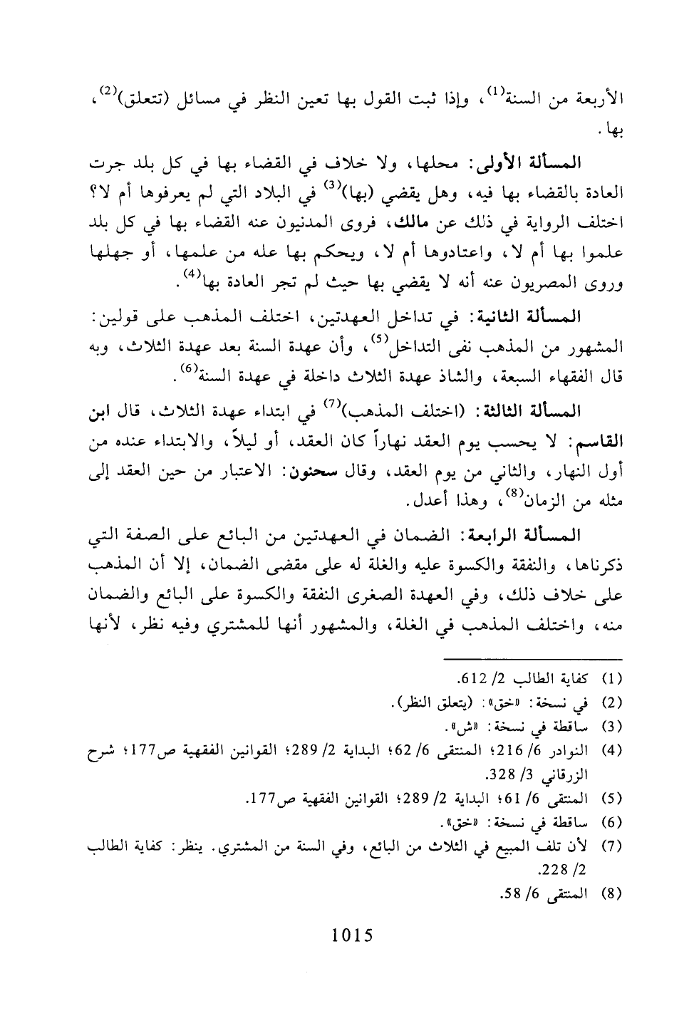 المسألة الثالثة: (اختلف المذهب) في ابتداء عهدة الثلاث، قال ابن القاسم: لا يحسب يوم العقد نهارًا كان العقد، أو ليلًا، والابتداء عنده من أول النهار، والثاني من يوم العقد، وقال سحنون: الاعتبار من حين العقد إلى مثله من الزمان، وهذا أعدل.