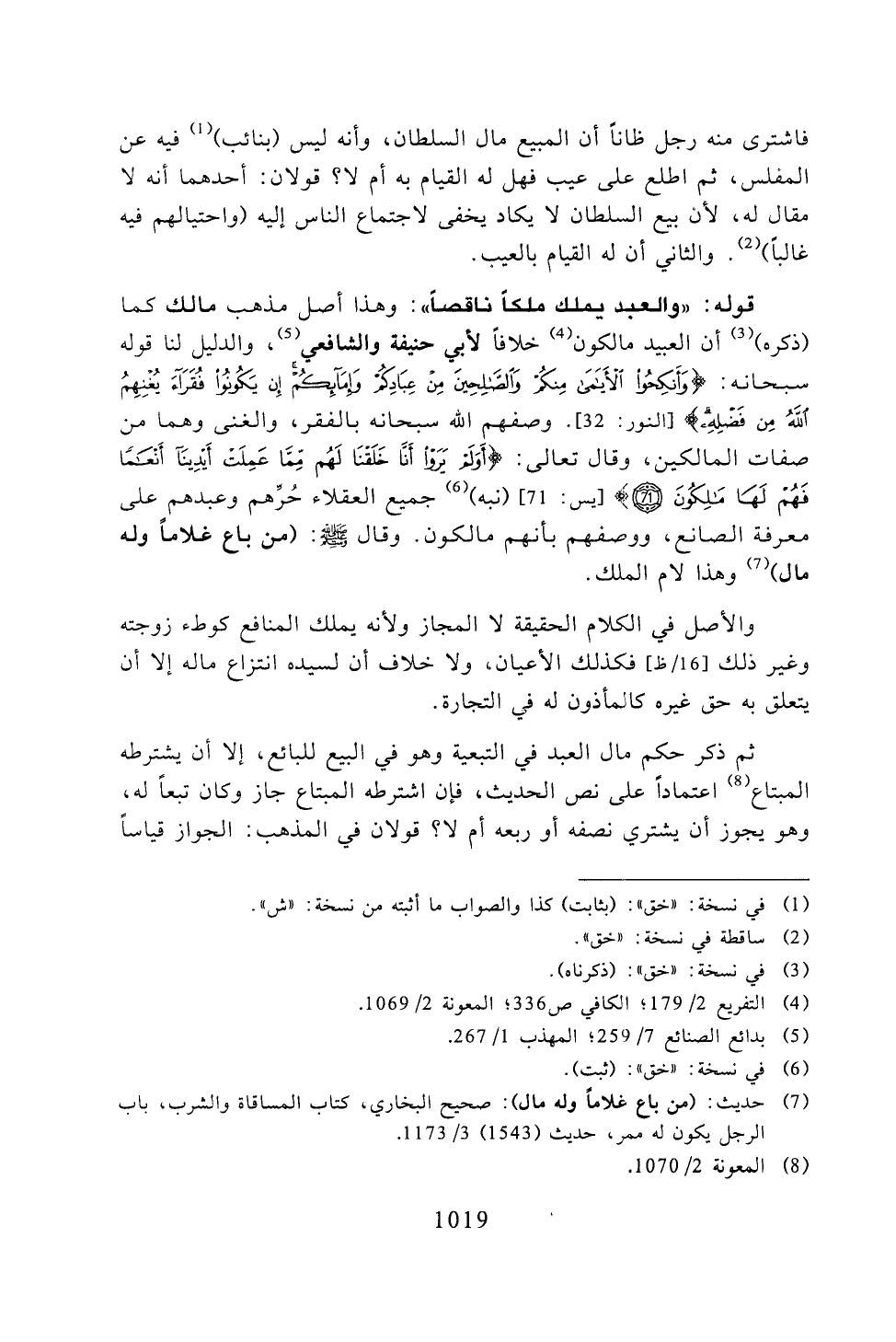 قوله: "والعبد يملك ملكًا ناقصًا": وهذا أصل مذهب مالك كما (ذكره) أن العبيد مالكون خلافًا لأبي حنيفة والشافعي، والدليل لنا قوله سبحانه: {وأنكحوا الأيامى منكم والصالحين من عبادكم وإمائكم إن يكونوا فقراء يغنهم الله من فضله} [النور: 32]. وصفهم الله سبحانه بالفقر، والغنى وهما من صفات المالكين، وقال تعالى: {أولم يروا أنا خلقنا لهم مما عملت أيدينا أنعامًا فهم لها مالكون} [يس: 71] (نبه) جميع العقلاء حرهم وعبدهم على معرفة الصانع، ووصفهم بأنهم مالكون. وقال- صلى الله عليه وسلم-: (من باع غلامًا وله مال) وهذا لأم مالك.