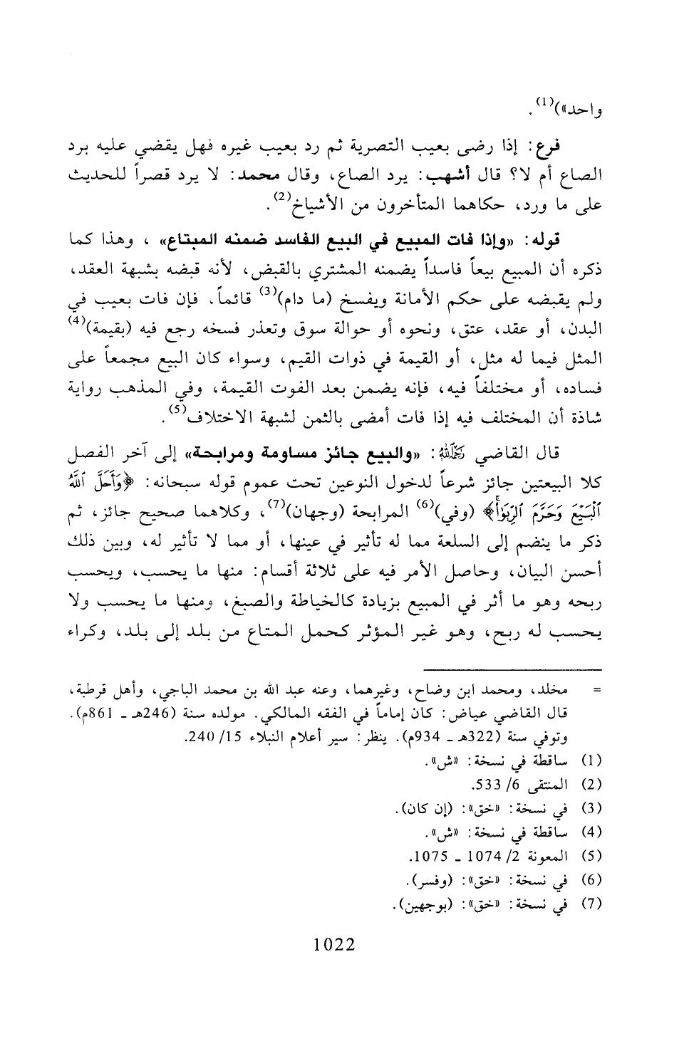 قال القاضي- رحمه الله-: "والبيع جائز مساومةً ومرابحةً" إلى آخر الفصل كلا البيعتين جائز شرعًا لدخول النوعين تحت عموم قوله سبحانه: {وأحل الله البيع وحرم الربا} (وفي) المرابحة (وجهان)، وكلاهما صحيح جائز، ثم أحسن البيان، وحاصل الأمر فيه على ثلاثة أقسام: منها ما يحسب، ويحسب ربحه وهو ما أثر في المبيع بزيادةٍ كالخياطة والصبغ، ومنها ما يحسب ولا يحسب له ربح، وهو غير المؤثر كحمل المبتاع من بلدٍ إلى بلد، وكراء