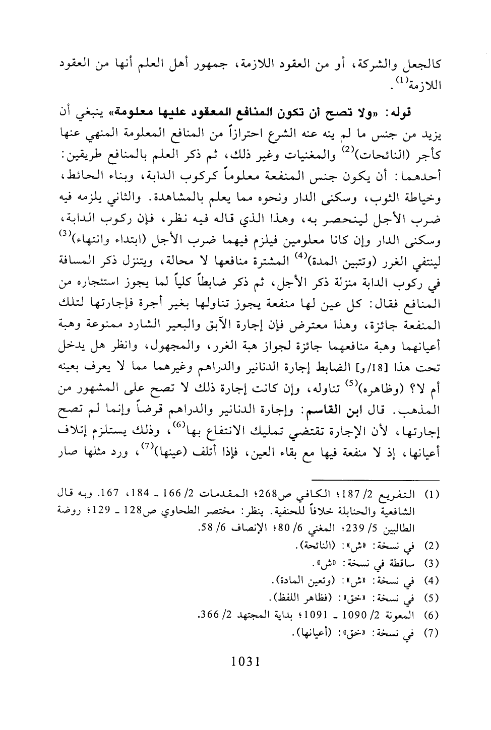 قوله: "ولا تصح أن تكون المنافع المعقود عليها معلومة" ينبغي أن يزيد من جنس ما لم ينه عنه الشرع احترازًا من المنافع المعلومة المنهي عنها كأجر (النائحات) والمغنيات وغير ذلك، ثم ذكر العلم بالمنافع طريقين: أحدهما: أن يكون جنس المنفعة معلومًا كركوب الدابة، وبناء الحائط، وخياطة الثوب، وسكنى الدار ونحوه مما يعلم بالمشاهدة. والثاني يلزمه فيه ضرب الأجل لينحصر به، وهذا الذي قاله فيه نظر، فإن ركوب الدابة، وسكنى الدار وإن كانا معلومين فيلزم فيهما ضرب الأجل (ابتداءً وانتهاءً) لينتفي الغرر (وتتبين المدة) المشتراة منافعها لا محالة، ويتنزل ذكر المسافة في ركوب الدابة منزلة ذكر الأجل، ثم ذكر ضابطًا كليًا لما يجوز استئجاره من المنافع فقال: كل عينٍ لها منفعة يجوز تناولها بغير أجرةٍ فإجارتها لتلك المنفعة جائزة، وهذا معترض فإن إجارة الآبق والبعير الشارد ممنوعة وهبة أعيانهما وهبة منافعهما جائزة لجواز هبة الغرر، والمجهول، انظر هل يدخل تحت هذا والضابط إجازة الدنانير والدراهم وغيرهما مما لا يعرف بعينه أم لا؟ (وظاهره) تناوله، وإن كانت إجارة ذلك لا تصح على المشهور من المذهب. قال ابن القاسم: وإجارة الدنانير والدراهم قرضًا وإنما لم تصح إجارتها، لأن الإجارة تقتضي تمليك الانتفاع بها، وذلك يستلزم إتلاف أعيانها، إذ لا منفعة فيها مع بقاء العين، فإذا أتلف (عينها)، ورد مثلها صار