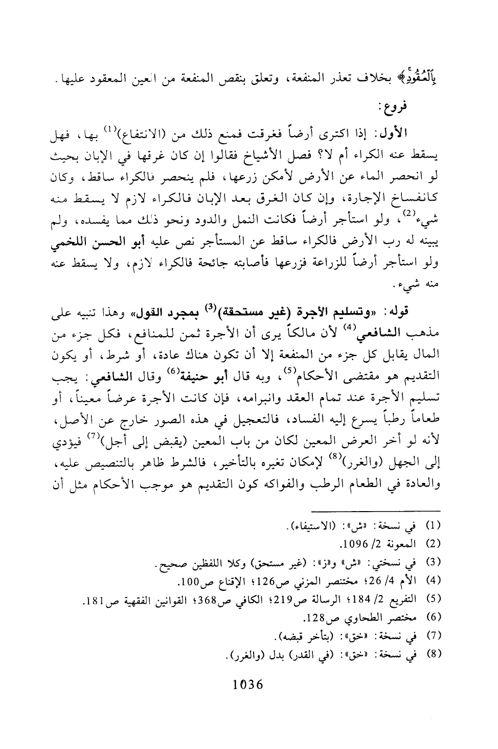 الأول: إذا اكترى أرضًا فغرقت فمنع ذلك من (الانتفاع) بها، فهل يسقط عنه الكراء أم لا؟ فصل الأشياخ فقالوا إن كان غرقها في الإبان بحيث لو انحصر الماء عن الرض لأمكن زرعها، فلم ينحصر فالكراء ساقط، وكان كانفساخ الإجارة، وإن كان الغرق بعد الإبان فالكراء لازم لا يسقط منه شيء، ولو استأجر أرضًا فكانت النمل والدود ونحو ذلك مما يفسده، ولم يبينه له رب الأرض فالكراء ساقط عن المستأجر نص عليه أبو الحسن اللخمي ولو استأجر أرضًا للزراعة فزرعها فأصابته جائعة فالكراء لازم، ولا يسقط عنه منه شيء.