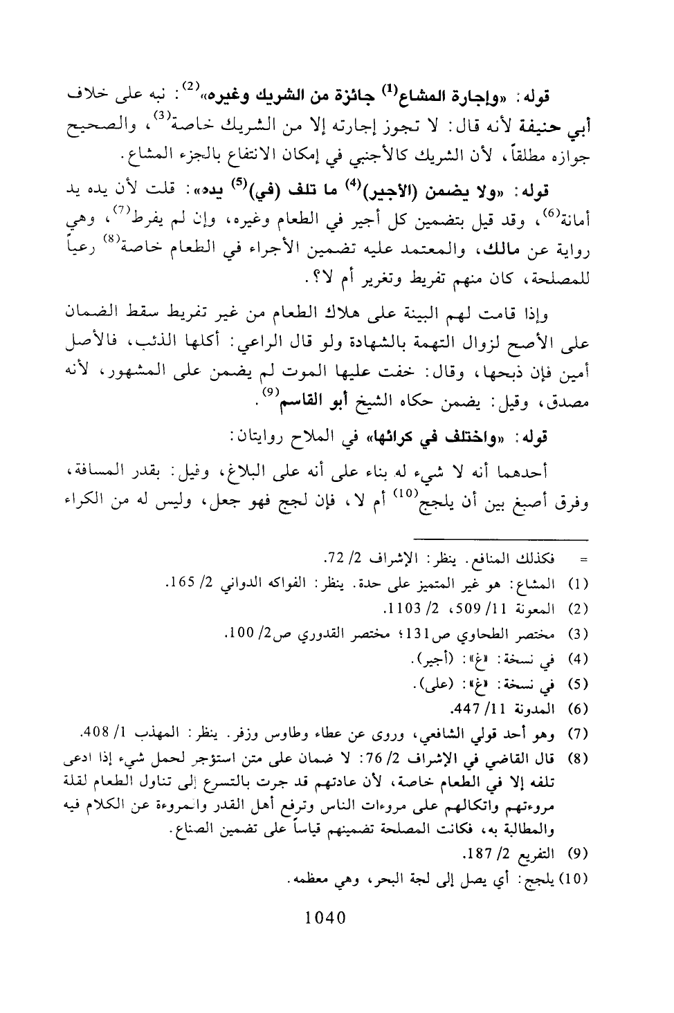 قوله: "ولا يضمن (الأجير) ما تلف (في) يده": قلت لأنه يده يد أمانة، وقد قيل بتضمين كل أجير في الطعام وغيره، وإن لم يفرط، وهي رواية عن مالك، والمعتمد عليه تضمين الأجراء في الطعام خاصة رعيًا للمصلحة، كان منهم تفريط وتغرير أم لا؟.