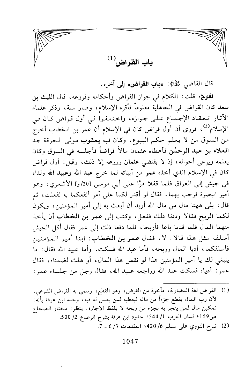 شرح: قلت: الكلام في جواز القراض وأحكامه وفروعه، قال الليث بن سعد كان القراض في الجاهلية معلومًا فأقره الإسلام، وصار سنة، وذكر علماء الآثار انعقاد الإجماع على جوازه، واختلفوا في أول قراض كان في الإسلام، فروى أن أول قراض كان في الإسلام أن عمر بن الخطاب أخرج من السوق من لا يعلم حكم البيوع، وكان فيه يعقوب مولى الحرقة جد العلاء بن عبد الرحمن فأعطاه عثمان مالًا قراضًا فأجلسه في السوق وكان يعلمه ويرعى أحواله، إذ لا يتقضي عثمان وورعه إلا ذلك، وقيل: أول قراض كان في الإسلام الذي أخذه عمر من أبنائه لما خرج عبد الله وعبيد الله ولداه في جيشٍ إلى العراق فلما قفلا مرا على أبي موسى الأشعري، وهو أمير البصرة فرحب بهما، فقال لو أقدر لكما على أمرٍ أنفعكما به لفعلت، ثم قال: بلى ههنا مال الله أريد أن أبعث به إلى أمير المؤمنين، ويكون لكما الربح فقالا وددنا ذلك ففعل، وكتب إلى عمر بن الخطاب أن ياخذ منهما المال فلما قدما باعا فأربحا، فلما دفعا ذلك إلى عمر فقال أكل الجيش أسلفه مثل هذا قالا: لا، فقال عمر بن الخطاب: ابنا أمير المؤمنين فأسلفكما، أديا المال وربحه، فأما عبد الله فسكت، وأما عبيد الله فقال: ما ينبغي لك يا أمير المؤمنين هذا لو نقص هذا المال، أو هلك لضمناه، فقال عمر: أدياه فسكت عبد الله وراجعه عبيد الله، فقال رجل من جلساء عمر: