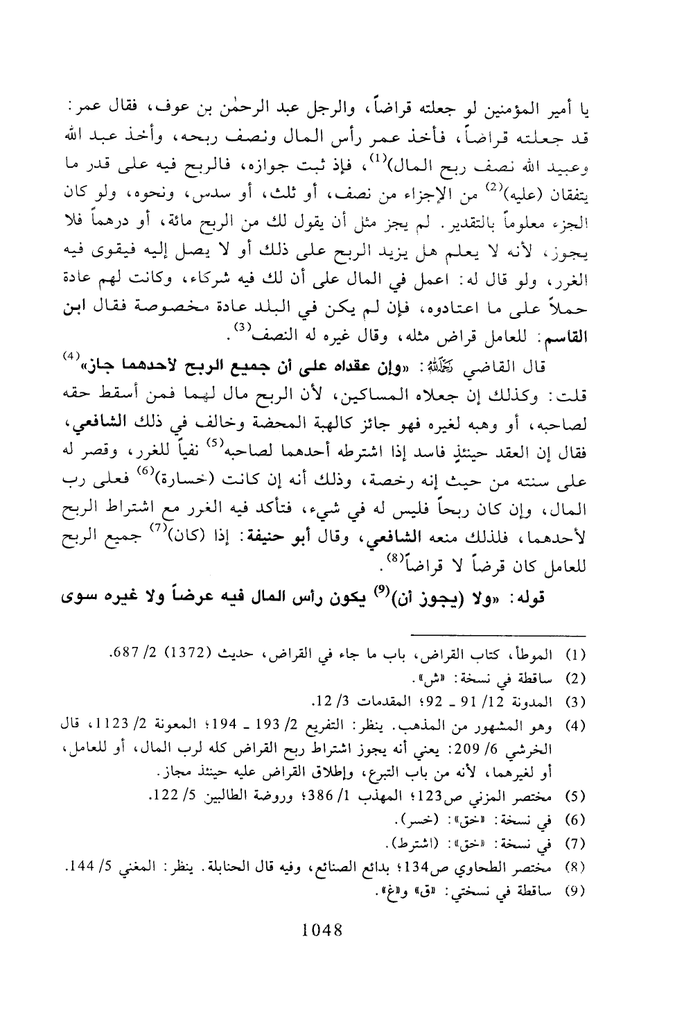 يا أمير المؤمنين لو جعلته قراضًا، والرجل عبد الرحمن بن عوف، فقال عمر: قد جعلته قراضًا، فأخذ عمر رأس المال ونصف ربحه، وأخذ عبد الله وعبيد الله نصف ربح المال)، فإذا ثبت جوازه، فالربح فيه على قدر ما يتفقان (عليه) من الإجزاء من نصفٍ، أو ثلثٍ، أو سدسٍ، ونحوه، ولو كان الجزء معلومًا بالتقدير. لم يجز مثل أن يقول لك من الربح مائة، أو درهمًا فلا يجوز، لأنه لا يعلم هل يزيد الربح على ذلك أو لا يصل إليه فيقوى فيه الغرر، ولو قال له: اعمل في المال على أن لك فيه شركاء، وكانت لهم عادة حملًا على ما اعتادوه، فإن لم يكن في البلد عادة مخصوصة فقال ابن القاسم: للعامل قراض مثله، وقال غيره له النصف.