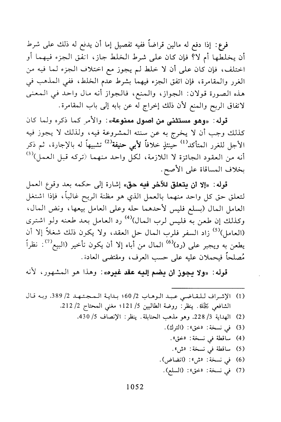 فرع: إذا دفع له مالين قراضًا ففيه تفصيل إما أن يدفع له ذلك على شرط أن يخلطها أم لا؟ فإن كان على شرط الخلط جاز، اتفق الجزء فيهما أو اختلف، فإن كان على أن لا خلط لم يجوز مع اختلاف الجزء لما فيه من الغرر والمقامرة، فإن اتفق الجزء فيهما بشرط عدم الخلط، ففي المذهب في هذه الصورة قولان: الجواز، والمنع، فالجواز أنه مال واحد في المعنى لاتفاق الربح والمنع لأن ذلك إخراج له عن بابه إلى باب المقامرة.