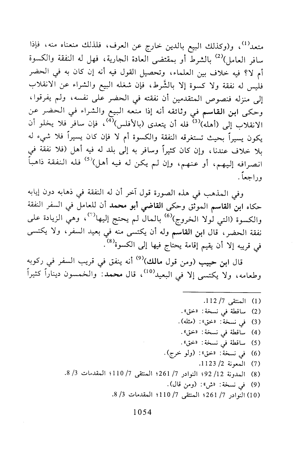متعد، (وكذلك البيع بالدين خارج عن العرف، فلذلك منعناه منه، فإذا سافر العامل) بالشرط أو بمقتضى العادة الجارية، فهل له النفقة والكسوة أم لا؟ فيه خلاف بين العلماء، وتحصيل القول فيه أنه إن كان به في الحضر فليس له نفقة ولا كسوة إلا بالشرط، فإن شغله البيع والشراء عن الانقلاب إلى منزله فنصوص المتقدمين أن نفقته في الحضر على نفسه، ولم يفرقوا، وحكى ابن القاسم في وثائقه أنه إذا منعه البيع والشراء في الحضر عن الانقلاب إلى (أهله) فله أن يتعدى (بالأفلس)، فإن سافر فلا يخلو أن يكون يسيرًا بحيث تستغرقه النفقة والكسوة أم لا فإن كان يسيرًا فلا شيء له بلا خلاف عندنا، وإن كان كثيرًا وسافر به إلى بلدٍ له فيه أهل (فلا نفقة في انصرافه إليهم، أو عنهم، وإن لم يكن له فيه أهل) فله النفقة ذاهبًا وراجعًا.