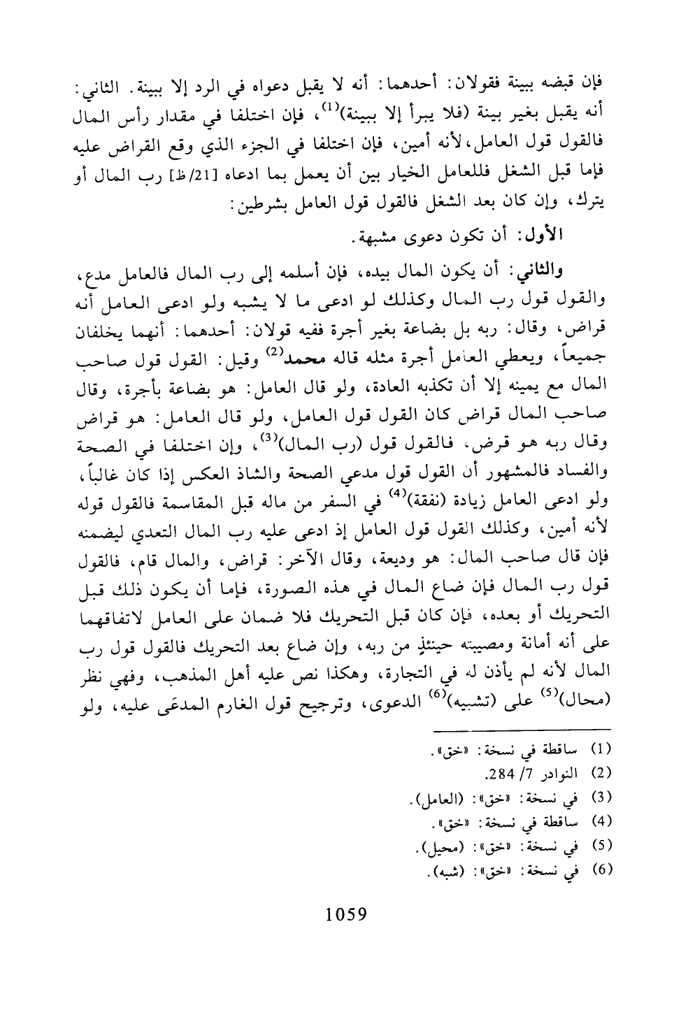 والثاني: أن يكون المال بيده، فإن أسلمه إلى رب المال فالعامل مدع، والقول قول رب المال وكذلك لو ادعى ما لا يشبه ولو ادعى العامل أنه قراض، وقال: ربه بل بضاعة بغير أجرة ففيه قولان: أحدهما: أنهما يخلفان جميعًا، ويعطى العامل أجرة مثله قاله محمد وقيل: القول قول صاحب المال مع يمينه إلا أن تكذبه العادة، ولو قال العامل: هو بضاعة بأجرة، وقال صاحب المال قراض كان القول قول العامل، ولو قال العامل: هو قراض وقال ربه هو قرض، فالقول قول (رب المال)، وإن اختلفا في الصحة والفساد فالمشهور أن القول قول مدعي الصحة والشاذ العكس إذا كان غالبًا، ولو ادعى العامل زيادة (نفقة) في السفر من ماله قبل المقاسمة فالقول قوله لأنه أمين، وكذلك القول قول العامل إذ ادعى عليه رب المال التعدي ليضمنه فإن قال صاحب المال: هو وديعة، وقال الآخر: قراض، والمال قام، فالقول قول رب المال فإن ضاع المال في هذه الصورة، فإما أن يكون ذلك قبل التحريك أو بعده، فإن كان قبل التحريك فلا ضمان على العامل لاتفاقهما على أنه أمانة ومصيبته حينئذٍ من ربه، وإن ضاع بعد التحريك فالقول قول رب المال لأنه لم يأذن له في التجارة، وهكذا نص عليه أهل المذهب، وفهي نظر (محال) على (تشبيه) الدعوى، وترجيح قول الغارم المدعى عليه، ولو