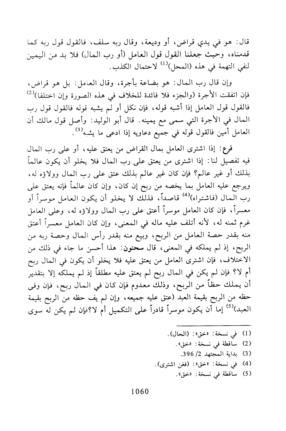 وإن قال رب المال: هو بضاعة بأجرة، وقال العامل: بل هو قراض، فإن اتفقت الأجرة (والجزء فلا فائدة للخلاف في هذه الصورة وإن اختلفا) فالقول قول العامل إذا أشبه قوله، فإن نكل أو لم يشبه قوله فالقول قول رب المال في الأجرة التي سمي مع يمينه. قال أبو الوليد: وأصل قول مالك أن العامل أمين فالقول قوله في جميع دعاويه إذا ادعى ما يشبه.