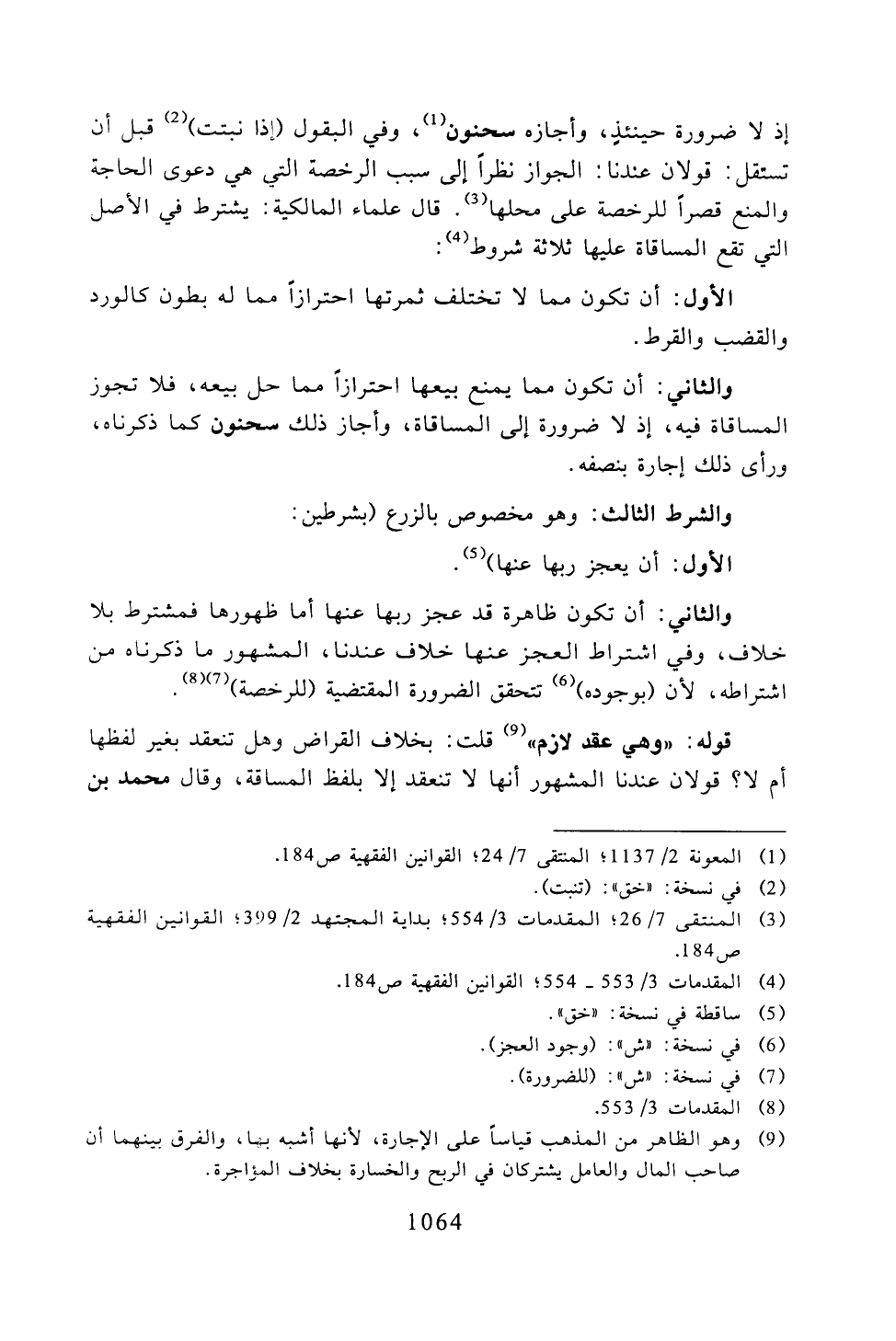 إذ لا ضرورة حينئذٍ، وأجازه سحنون، وفي البقول (إذا نبتت) قبل أن تستقل: قولان عندنا: الجواز نظرًا إلى سبب الرخصة التي هي دعوى الحاجة والمنع قصرًا للرخصة على محلها. قال علماء المالكية: يشترط في الأصل التي تقع المساقاة عليها ثلاثة شروط: