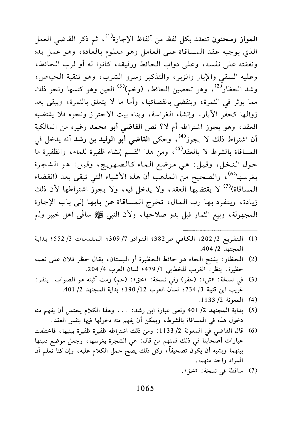 المواز وسحنون تنعقد بكل لفظ من ألفاظ الإجارة، ثم ذكر القاضي العمل الذي يوجبه عقد المساقاة على العامل وهو معلوم بالعادة، وهو عمل يده ونفقته على نفسه، وعلى دواب الحائط ورقيقه، كانوا له أو لرب الحائط، وعليه السقى والإبار والزبر، والتذكير وسرو الشرب، وهو تنقية الحياض، وشد الحظار، وهو تحصين الحائط، (وخم) العين وهو كنسها ونحو ذلك مما يوثر في الثمرة، وينقضي بانقضائها، وأما ما لا يتعلق بالثمرة، ويبقى بعد زوالها كحفر الآبار، وإنشاء الغراسة، وبناء بيت الاحتراز ونحوه فلا يقتضيه العقد، وهو يجوز اشتراطه أم لا؟ نص القاضي أبو محمد وغيره من المالكية أن اشتراط ذلك لا يجوز، وحكى القاضي أبو الوليد بن رشد أنه يدخل في المساقاة بالشرط لا بالعقد، ومن هذا القسم إنشاء ظفيرة للماء، والظفيرة ما حول النخل، وقيل: هي موضع الماء كالصهريج، وقيل: هو الشجرة يغرسها، والصحيح من المذهب أن هذه الأشياء التي تبقى بعد (انقضاء المساقاة) لا يقتضيها العقد، ولا يدخل فيه، ولا يجوز اشتراطها لأن ذلك زيادة، وينفرد بها رب المال، تخرج المساقاة عن بابها إلى باب الإجارة المجهولة، وبيع الثمار قبل بدو صلاحها، ولأن النبي -صلى الله عليه وسلم- ساقى أهل خيبر ولم