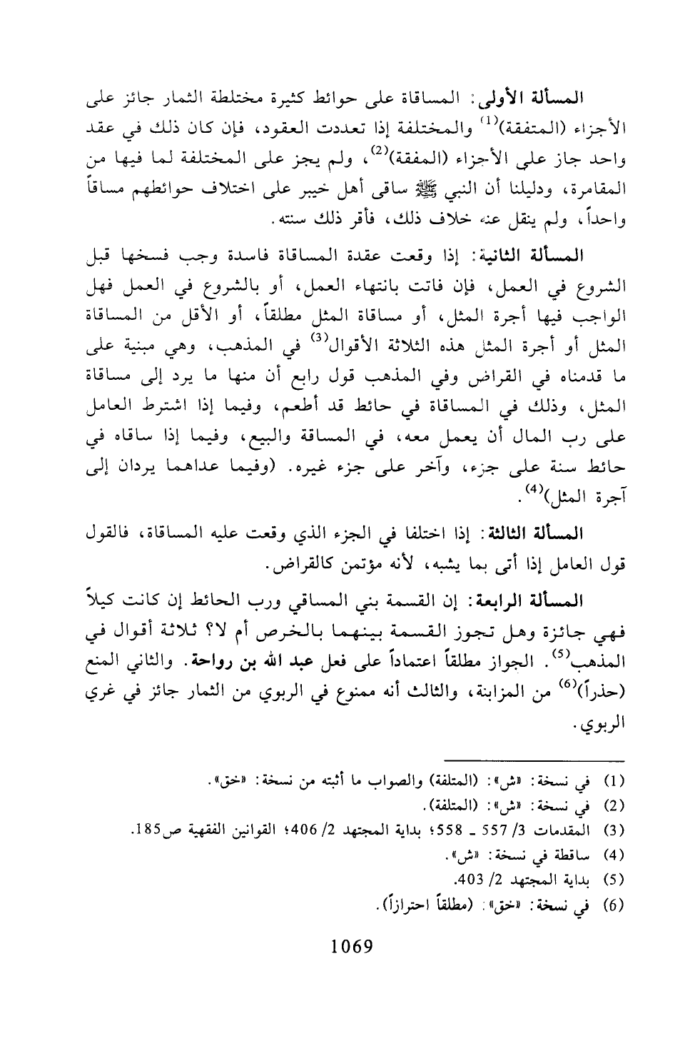 المسألة الرابعة: إن القسمة بني المساقي ورب الحائط إن كانت كيلًا فهي جائزة وهل تجوز القسمة بينهما بالخرص أم لا؟ ثلاثة أقوال في المذهب. الجواز مطلقًا اعتمادًا على فعل عبد الله بن رواحة. والثاني المنع (حذرًا) من المزابنة، والثالث أنه ممنوع في الربوي من الثمار جائز في غري الربوي.