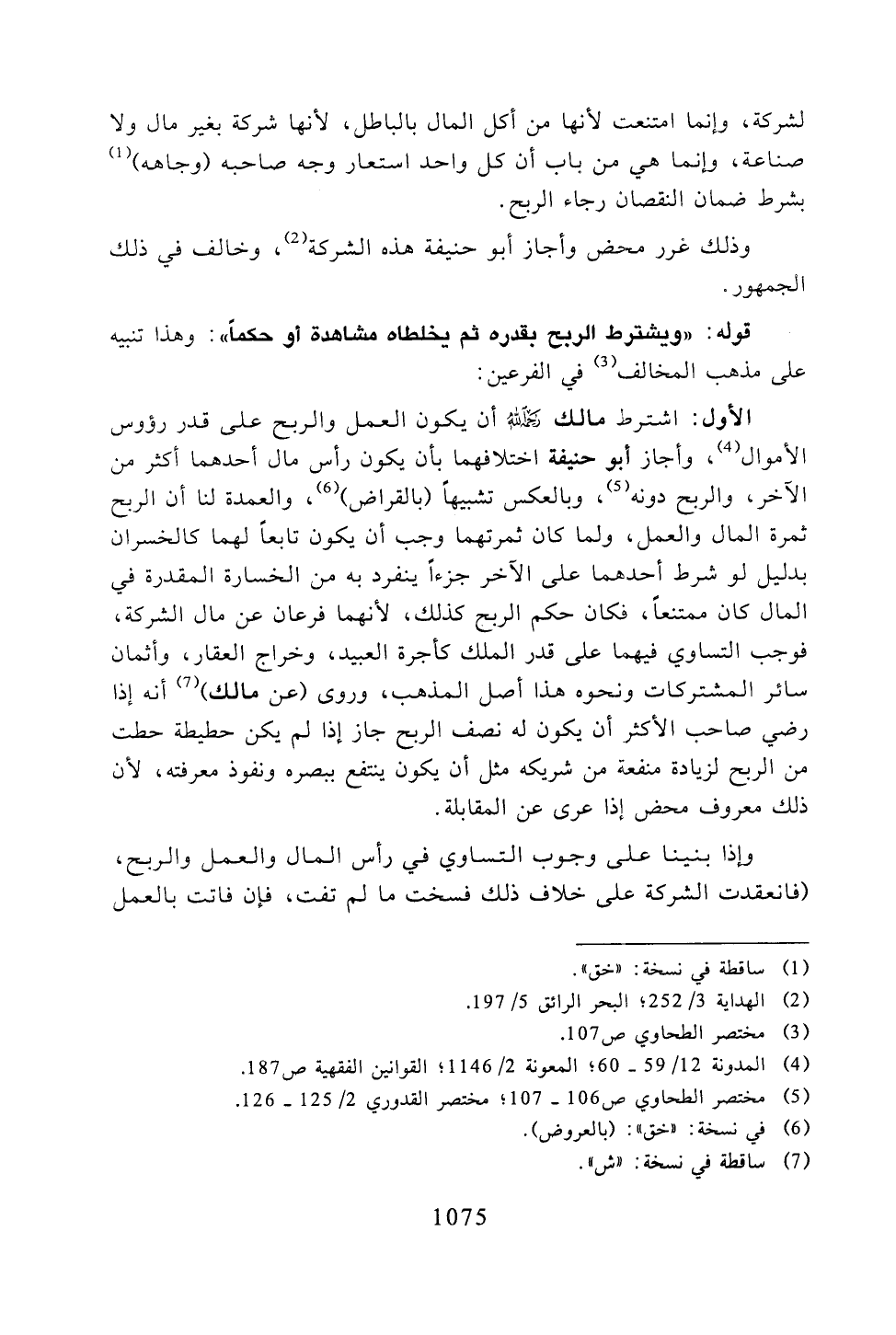الأول: اشترط مالك -رحمه الله- أن يكون العمل والربح على قدر رؤوس الأموال، وأجاز أبو حنيفة اختلافهما بأن يكون رأس مال أحدهما أكثر من الآخر، والربح دونه، وبالعكس تشبيهًا (بالقراض)، والعمدة لنا أن الربح ثمرة المال والعمل، ولما كان ثمرتهما وجب أن يكون تابعًا لهما كالخسران بدليل لو شرط أحدهما على الآخر جزءًا ينفرد به من الخسارة المقدرة في المال كان ممتنعًا، فكان حكم الربح كذلك، لأنهما فرعان عن مال الشركة، فوجب التساوي فيهما على قدر الملك كأجرة العبيد، وخراج العقار، وأثمان سائر المشتركات ونحوه هذا أصل المذهب، وروى (عن مالك) أنه إذا رضي صاحب الأكثر أن يكون له نصف الربح جاز إذا لم يكن حطيطة حطت من الربح لزيادة منفعة من شريكه مثل أن يكون ينتفع ببصره ونفوذ معرفته، لأن ذلك معروف محض إذا عرى عن المقابلة.