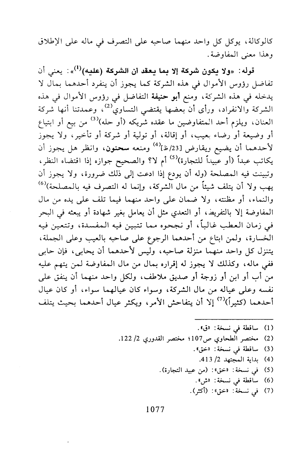 قوله: "ولا يكون شركة إلا بما يعقد أن الشركة (عليه) ": يعني أن تفاضل رؤوس الأموال في هذه الشركة كما يجوز أن ينفرد أحدهما بمال لا يدخله في هذه الشركة، ومنع أبو حنيفة التفاضل في رؤوس الأموال في هذه الشركة والانفراد، ورأى أن بعضها يقتضي التساوي، وعمدتنا أنها شركة العنان، ويلزم أحد المتفاوضين ما عقده شريكه (أو حله) من بيع أو ابتياع أو وضيعة أو رضاء بعيب، أو إقالة، أو تولية أو شركة أو تأخير، ولا يجوز لأحدهما أن يضيع ويقارض ومنعه سحنون، وانظر هل يجوز أن يكاتب عبدًا (أو عبيدًا للتجارة) أم لا؟ والصحيح جوازه إذا اقتضاه النظر، وتبينت فيه المصلحة (وله أن يودع إذا ادعت إلى ذلك ضرورة، ولا يجوز أن يهب ولا أن يتلف شيئًا من مال الشركة، وإنما له التصرف فيه بالمصلحة) والنماء، أو مظنته، ولا ضمان على واحد منهما فيما تلف على يده من مال المفاوضة إلا بالتفريط، أو التعدي مثل أن يعامل بغير شهادة أو يبعثه في البحر في زمان العطب غالبًا، أو نجحوه مما تتبين في المفسدة، وتتعين فيه الخسارة، ولمن ابتاع من أحدهما الرجوع على صاحبه بالعيب وعلى الجملة، يتنزل كل واحد منهما منزلة صاحبه، وليس لأحدهما أن يحابى، فإن حابى ففي ماله، وكذلك لا يجوز له إقراره بمال من مال المفاوضة لمن يتهم عليه من أب أو ابن أو زوجة أو صديق ملاطف، ولكل واحد منهما أن ينفق على نفسه وعلى عياله من مال الشركة، وسواء كان عيالهما سواء، أو كان عيال أحدهما (كثيرًا) إلا أن يتفاحش الأمر، ويكثر عيال أحدهما بحيث يتلف
