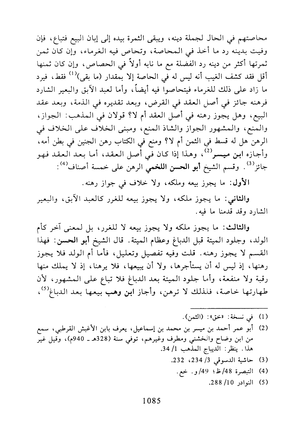 والثالث: ما يجوز ملكه ولا يجوز بيعه لا للغرر، بل لمعنى آخر كأم الولد، وجلود الميتة قبل الدباغ وعظام الميتة. قال الشيخ أبو الحسن: فهذا القسم لا يجوز رهنه. قلت وفيه تفصيل وتعليل، فأما أم الولد فلا يجوز رهنها، إذ ليس له أن يستأجرها، ولا أن يبيعها، فلا يرهنا، إذ لا يملك منها رقبة ولا منفعة، وأما جلود الميتة بعد الدباغ فلا تباع على المشهور، لأن طهارتها خاصة، فلذلك لا ترهن، وأجاز ابن وهب بيعها بعد الدباغ،