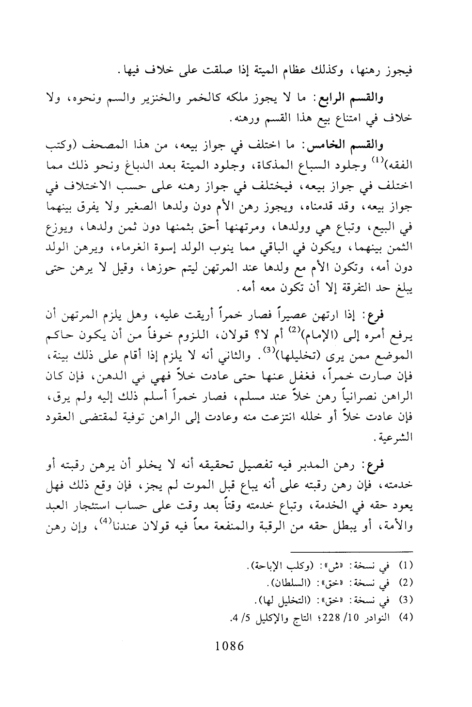 والقسم الخامس: ما اختلف في جواز بيعه، من هذا المصحف (وكتب الفقه) وجلود السباع المذكاة، وجلود الميتة بعد الدباغ ونحو ذلك مما اختلف في جواز بيعه، فيختلف في جواز رهنه على حسب الاختلاف في جواز بيعه، وقد قدمناه، ويجوز رهن الأم دون ولدها الصغير ولا يفرق بينهما في البيع، وتباع هي وولدها، ومرتهنها أحق بثمنها دون ثمن ولدها، ويوزع الثمن بينهما، ويكون في الباقي مما ينوب الولد إسوة الغرماء، ويرهن الولد دون أمه، وتكون الأم مع ولدها عند المرتهن ليتم حوزها، وقيل لا يرهن حتى يبلغ حد التفرقة إلا أن تكون معه أمه.