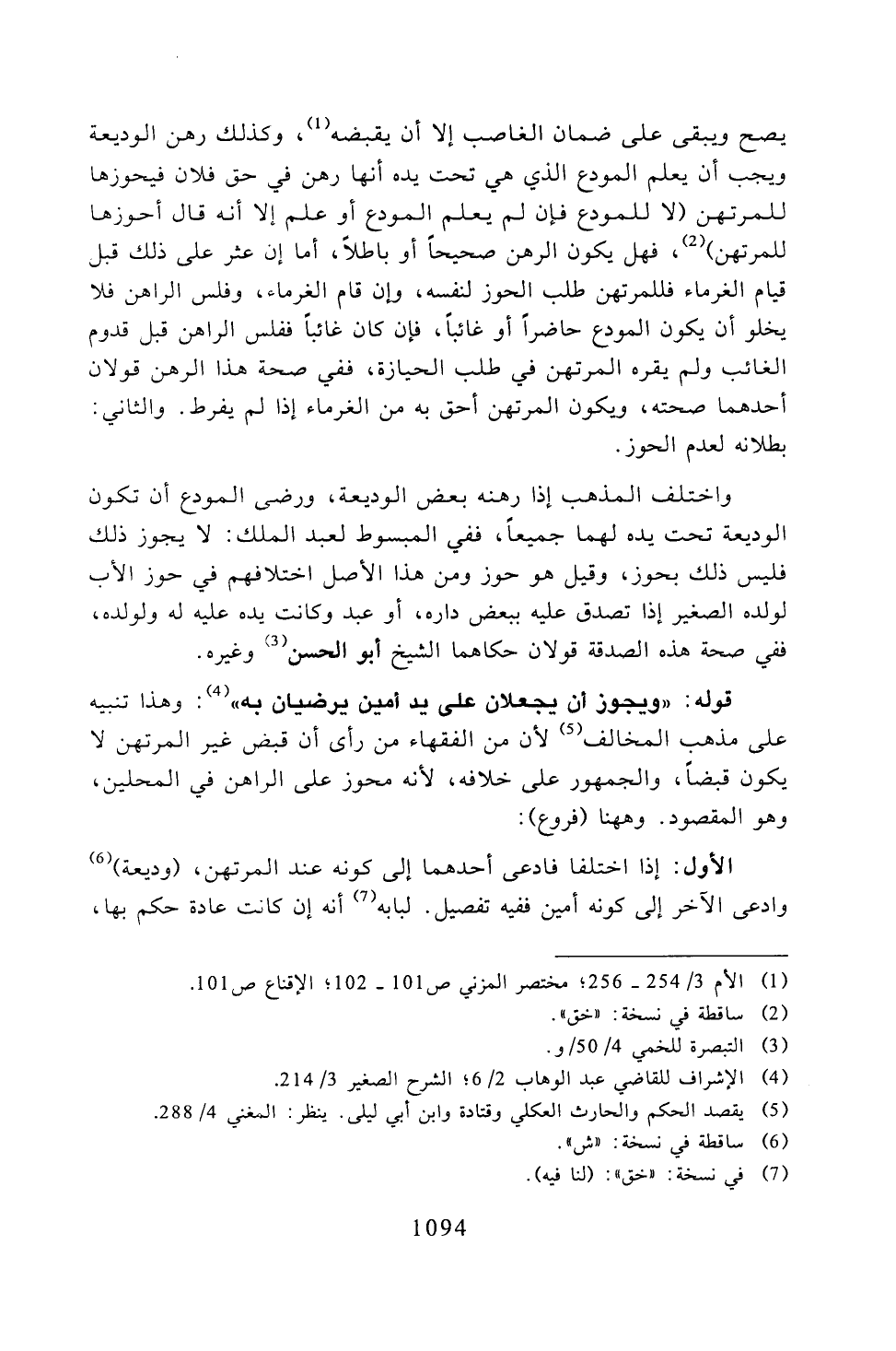 واختلف المذهب إذا رهنه بعض الوديعة، ورضى المودع أن تكون الوديعة تحت يده لهما جميعًا، ففي المبسوط لعبد الملك: لا يجوز ذلك فليس ذلك بحوز، وقيل هو حوز ومن هذا الأصل اختلافهم في حوز الأب لولده الصغير إذا تصدق عليه ببعض داره، أو عبد وكانت يده عليه له ولولده، ففي صحة هذه الصدقة قولان حكاهما الشيخ أبو الحسن وغيره.