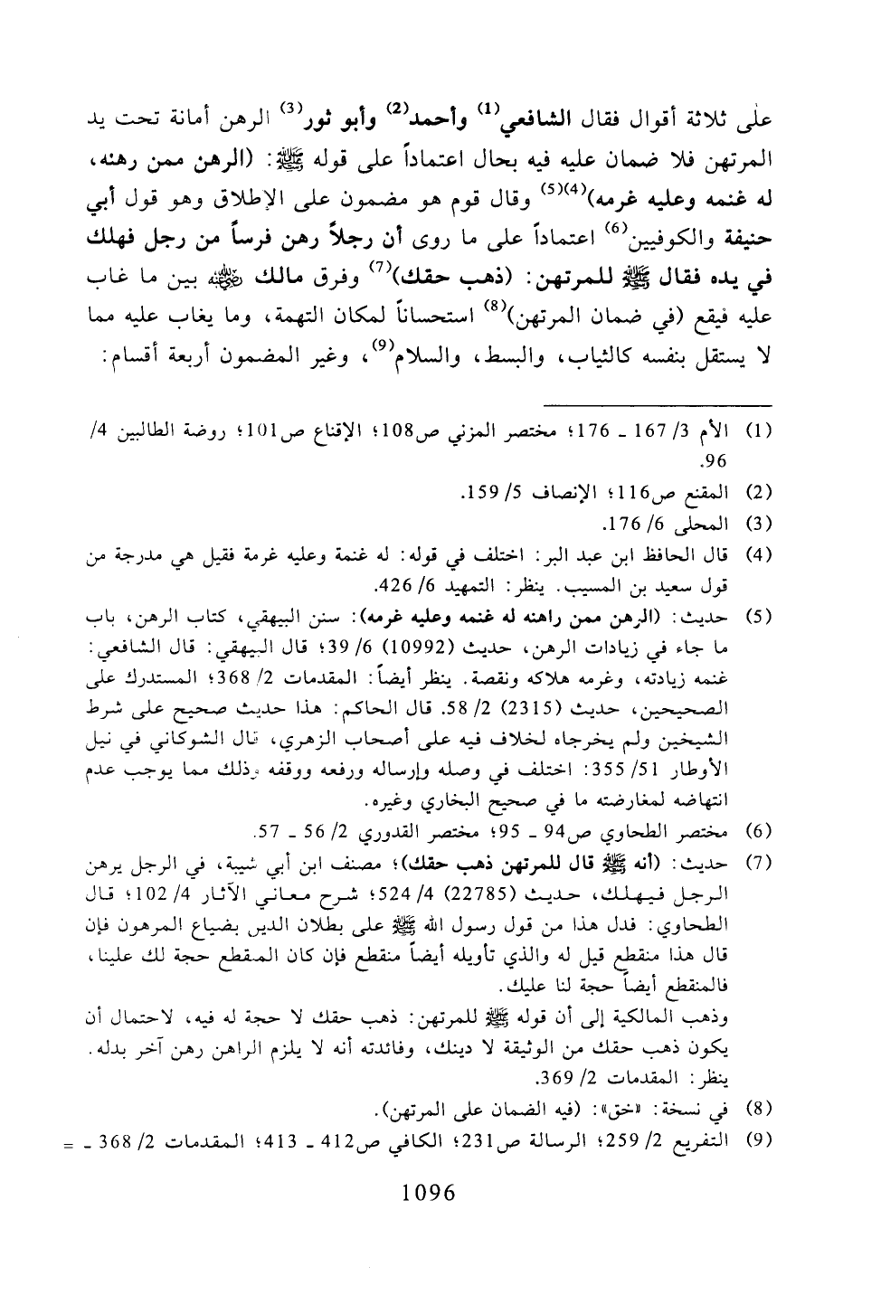على ثلاثةِ أقوال فقال الشافعي وأحمد وأبو ثور الرهن أمانة تحت يد المرتهن فلا ضمان عليه فيه بحال اعتمادًا على قوله -صلى الله عليه وسلم-: «الرهن ممن رهنه، له غنمه وعليه غرمه» وقال قوم هو مضمون على الإطلاق وهو قول أبي حنيفة والكوفيين اعتمادًا على ما روى أن رجلًا رهن فرسًا من رجل فهلك في يده فقال -صلى الله عليه وسلم- للمرتهن: (ذهب حقك) وفرق مالك -رضي الله عنه- بين ما غاب عليه فيقع (في ضمان المرتهن) استحسانًا لمكان التهمة، وما يغاب عليه مما لا يستقل بنفسه كالثياب، والبسط، والسلام، وغير المضمون أربعة أقسام: