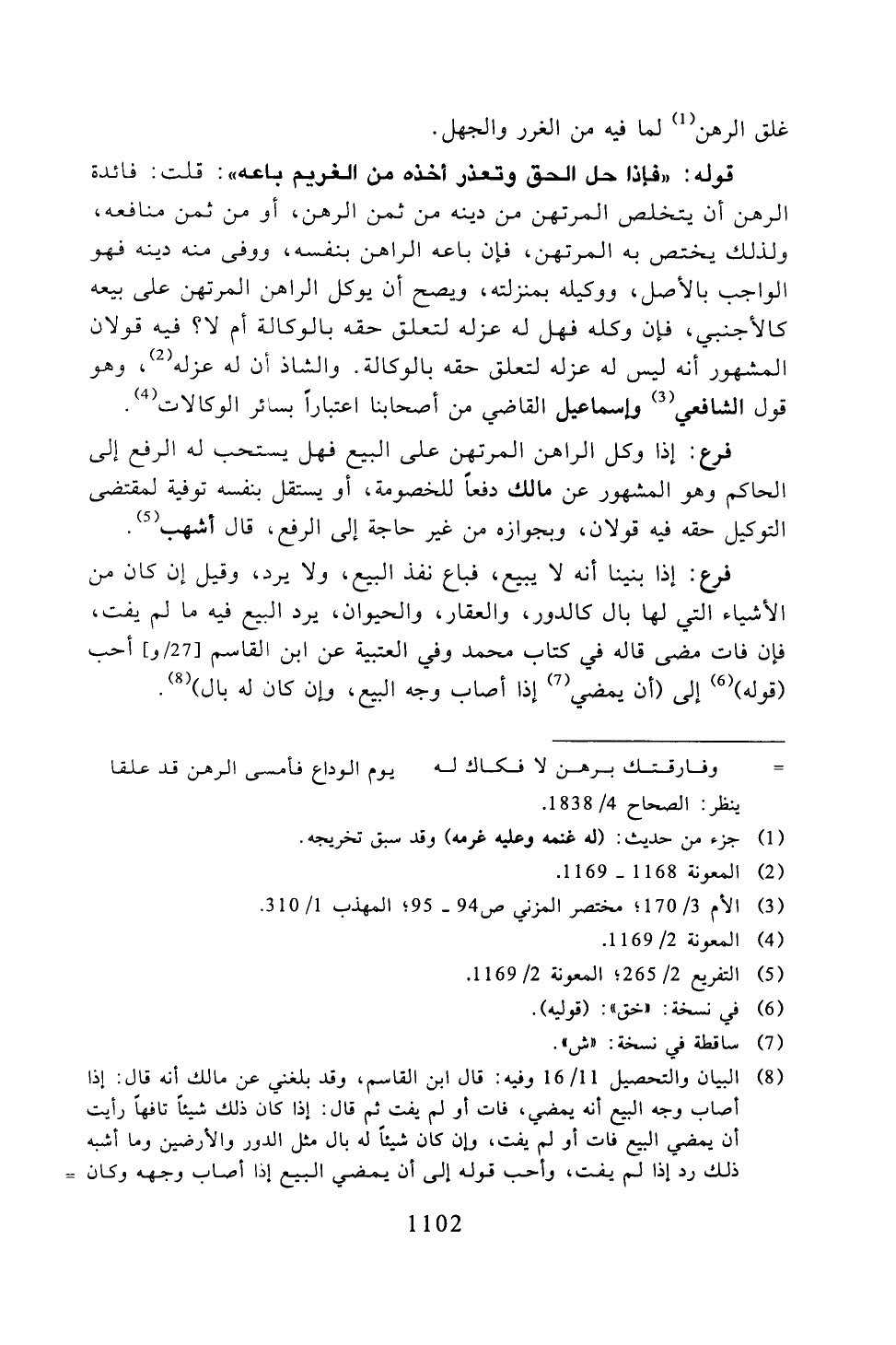 قوله: "فإذا حل الحق وتعذر أخذه من الغريم باعه": قلت: فائدة الرهن أن يتخلص المرتهن من دينه من ثمن الرهن، أو من ثمن منافعه، ولذلك يختص به المرتهن، فإن باعه الراهن بنفسه، ووفى منه دينه فهو الواجب بالأصل، ووكيله بمنزلته، ويصح أن يوكل الراهن المرتهن على بيعه كالأجنبي، فإن وكله فهل له عزله لتعلق حقه بالوكالة أم لا؟ فيه قولان المشهور أنه ليس له عزله لتعلق حقه بالوكالة. والشاذ أن له عزله، وهو قول الشافعي وإسماعيل القاضي من أصحابنا اعتبارًا بسائر الوكالات.