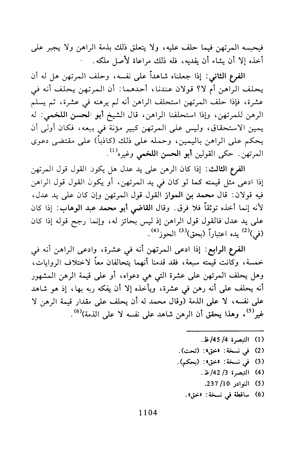الفرع الرابع: إذا ادعى المرتهن أنه في عشرة، وادعى الراهن أنه في خمسة، وكانت قيمته سبعة، فقد قدمنا أنهما يتحالفان معًا لاختلاف الروايات، وهل يحلف المرتهن على عشرة التي هي دعواه، أو على قيمة الرهن المشهور أنه يحلف على أنه رهن في عشرة، ويأخذه إلا أن يفكه ربه بها، إذ هو شاهد على نفسه، لا على الذمة (وقال محمد له أن يحلف على مقدار قيمة الرهن لا غير، وهذا يحقق أن الرهن شاهد على نفسه لا على الذمة).