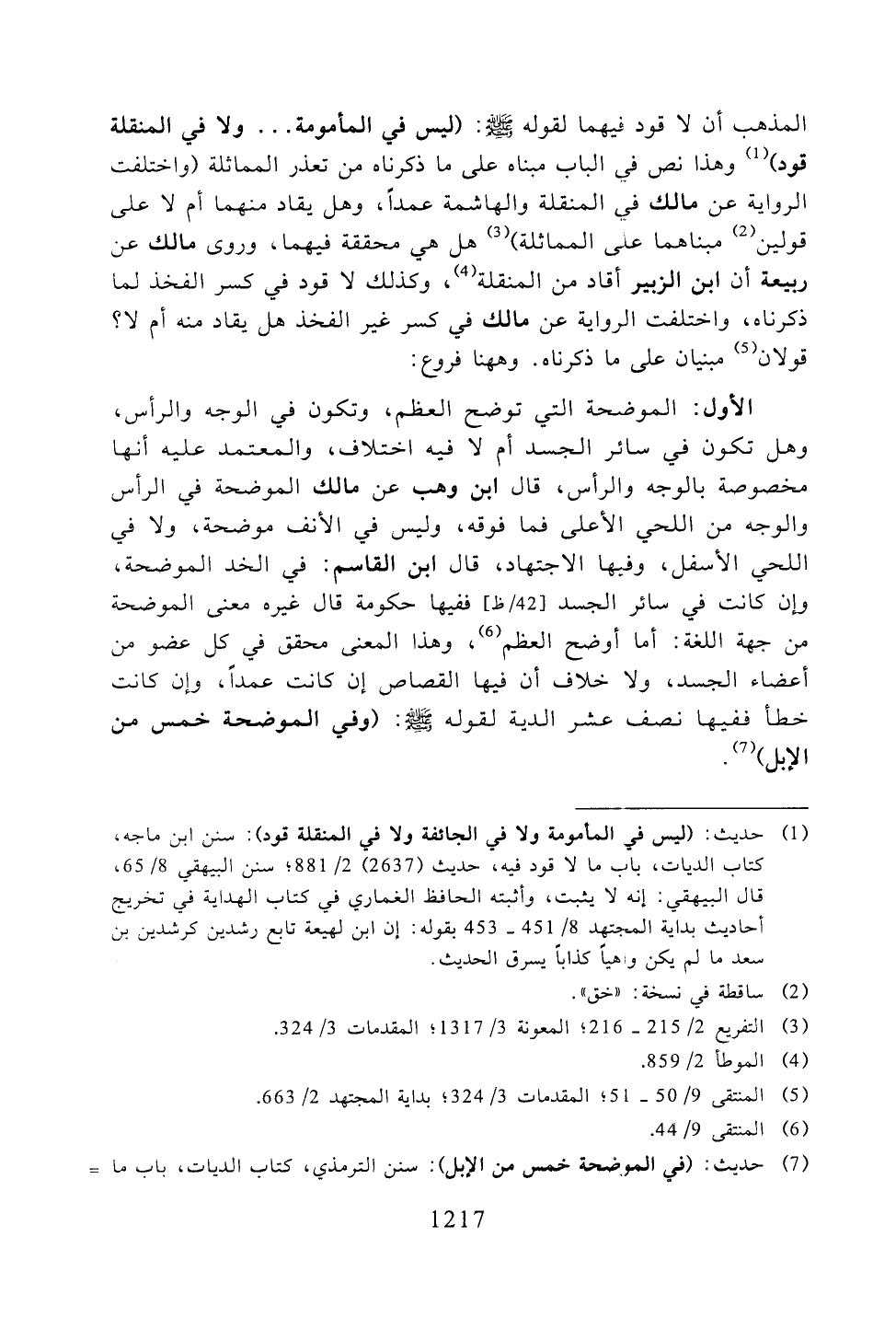 الأول: الموضحة التي توضح العظم، وتكون في الوجه والرأس، وهل تكون في سائر الجسد أم لا فيه اختلاف، والمعتمد عليه أنها مخصوصة بالوجه والرأس، قال ابن وهب عن مالك الموضحة في الرأس والوجه من اللحي الأعلى فما فوقه، وليس في الأنف موضحة، ولا في اللحي الأسفل، وفيها الاجتهاد، قال ابن القاسم: في الخد الموضحة، وإن كانت في سائر الجسد ففيها حكومة قال غيره معنى الموضحة من جهة اللغة: أما أوضح العظم، وهذا المعنى محقق في كل عضو من أعضاء الجسد، ولا خلاف أن فيها القصاص إن كانت عمدًا، وإن كانت خطأ ففيها نصف عشر الدية لقوله -صلى اله عليه وسلم-: (وفي الموضحة خمس من الإبل).