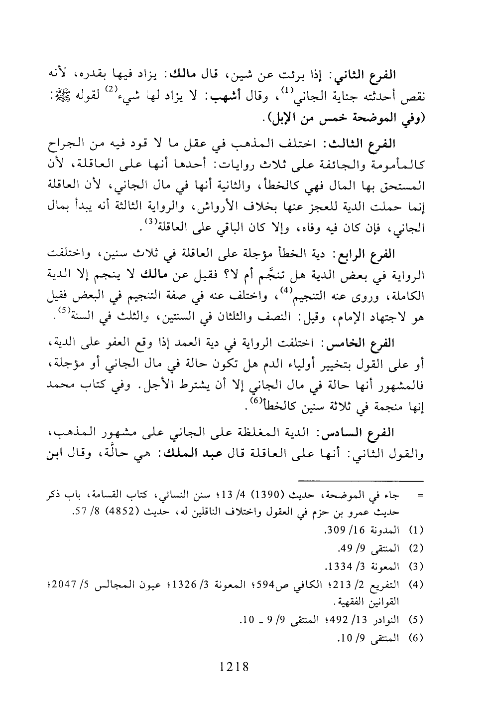 الفرع الرابع: دية الخطأ مؤجلة على العاقلة في ثلاث سنين، واختلفت الرواية في بعض الدية هل تنجم أو لا؟ فقيل عن مالك لا ينجم إلا الدية الكاملة، وروى عنه التنجيم، واختلف عنه في صفة التنجيم في البعض فقيل هو لاجتهاد الإمام، وقيل: النصف والثلثان في السنتين، والثلث في السنة.
