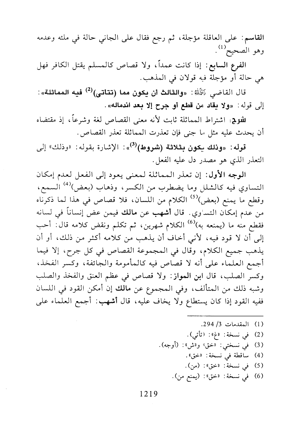 الوجه الأول: إن تعذر المماثلة لمعنى يعود إلى الفعل لعدم إمكان التساوي فيه كالشلل وما يضطرب من الكسر، وذهاب (بعض) السمع، وقطع ما يمنع (بعض) الكلام من اللسان، فلا قصاص في هذا لما ذكرناه من عدم إمكان التساوي. قال أشهب عن مالك فيمن عض إنسانًا في لسانه فقطع منه ما (يمنعه به) الكلام شهرين، ثم تكلم ونقض كلامه قال: أحب إلى أن لا قود فيه، لأني أخاف أن يذهب من كلامه أكثر من ذلك، أو أن يذهب جميع الكلام، وقال في المجموعة القصاص في كل جرح، إلا فيما أجمع العلماء على أنه لا قصاص فيه كالمأمومة والجائفة، وكسر الفخذ، وكسر الصلب، قال ابن المواز: ولا قصاص في عظم العنق والفخذ والصلب وشبه ذلك من المتألف، وفي المجموع عن مالك إن أمكن القود في اللسان ففيه القود إذا كان يستطاع ولا يخاف عليه، قال أشهب: أجمع العلماء على