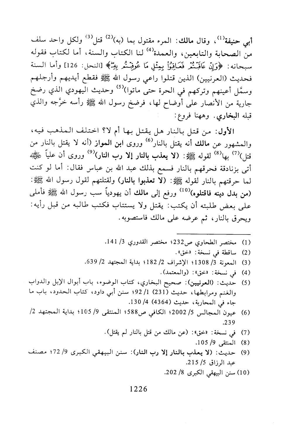الأول: من قتل بالنار هل يقتل بها أم لا؟ اختلف المذهب فيه, والمشهور عن مالك أنه يقتل بالنار وروى ابن المواز (أنه لا يقتل بالنار من قتل) بها لقوله -صلى الله عليه وسلم-: (لا يعذب بالنار إلا رب النار) وروى أن علياً رضى الله عنه أتى بزنادقة فحرقهم بالنار فسمع بذلك عبد الله بن عباس فقال: اما لو كنت لما حرقتهم بالنار لقوله -صلى الله عليه وسلم-: (لا يعذبوا بالنار) ولقتلتهم لقول رسول الله -صلى الله عليه وسلم-: (من بدل دينه فاقتلوه) ورفع إلى مالك أن يهوديًا سب رسول الله -صلى الله عليه وسلم- فأملى على بعض طلبته أن يكتب: يقتل ولا يستتاب فكتب طالبه من قبل رأيه: ويحرق بالنار, ثم عرضه على مالك فاستصوبه.
