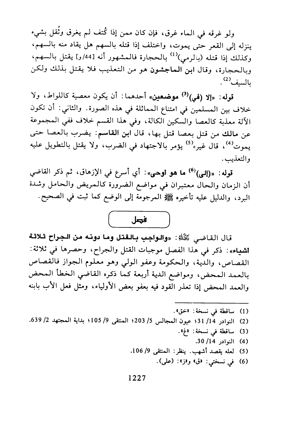 قوله: "إلا (في) موضعين" أحدهما: أن يكون معصية كاللواط, ولا خلاف بين المسلمين في امتناع المماثلة في هذه الصورة. والثاني: أن تكون الآلة معذبة كالعصا والسكين الكالة, وفي هذا القسم خلاف ففي المجموعة عن مالك من قتل بعصا قتل بها, قال ابن القاسم: يضرب بالعصا حتى يمو, قال غيره يؤمر بالاجتهاد في الضرب, ولا يقتل بالتطويل عليه والتعذيب.