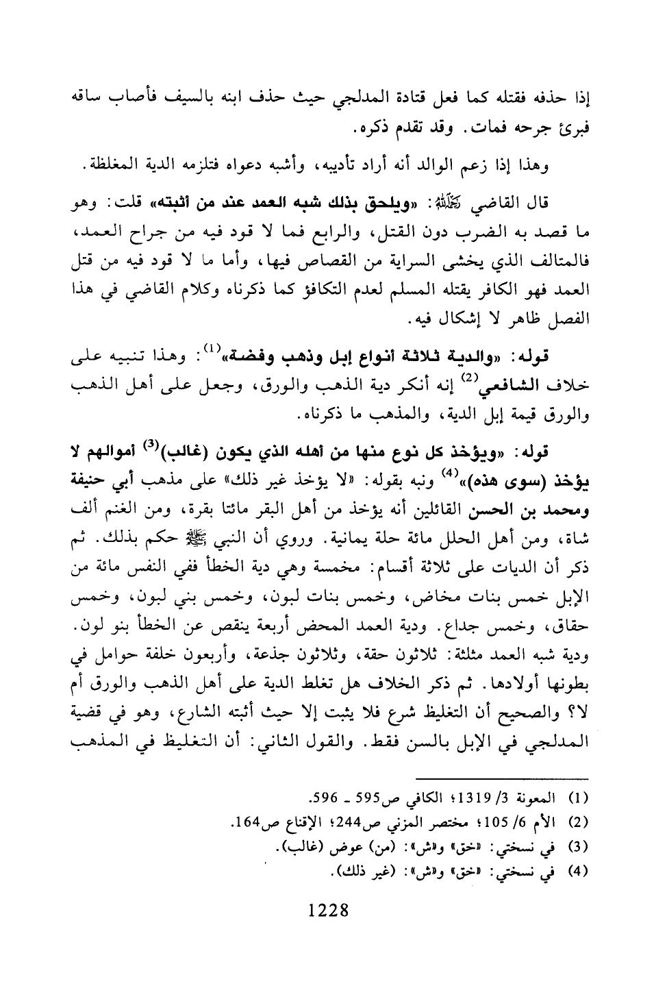 وهذا إذا زعم الوالد أنه أراد تأديبه, وأشبه دعواه فتلزمه الدية المغلظة. قال القاضي رحمه الله: "ويلحق بذلك شبه العمد عند من أثبته" قلت: وهو ما قصد به الضرب دون القتل, والرابع فما لا قود فيه من جراح العمد, فالمتالف الذي يخشى السراية من القصاص فيها, وأما ما لا قود فيه من قتل العمد فهو الكافر يقتله المسلم لعدم التكافؤ كما ذكرناه وكلام القاضي في هذا الفصل ظاهر لا إشكال فيه.