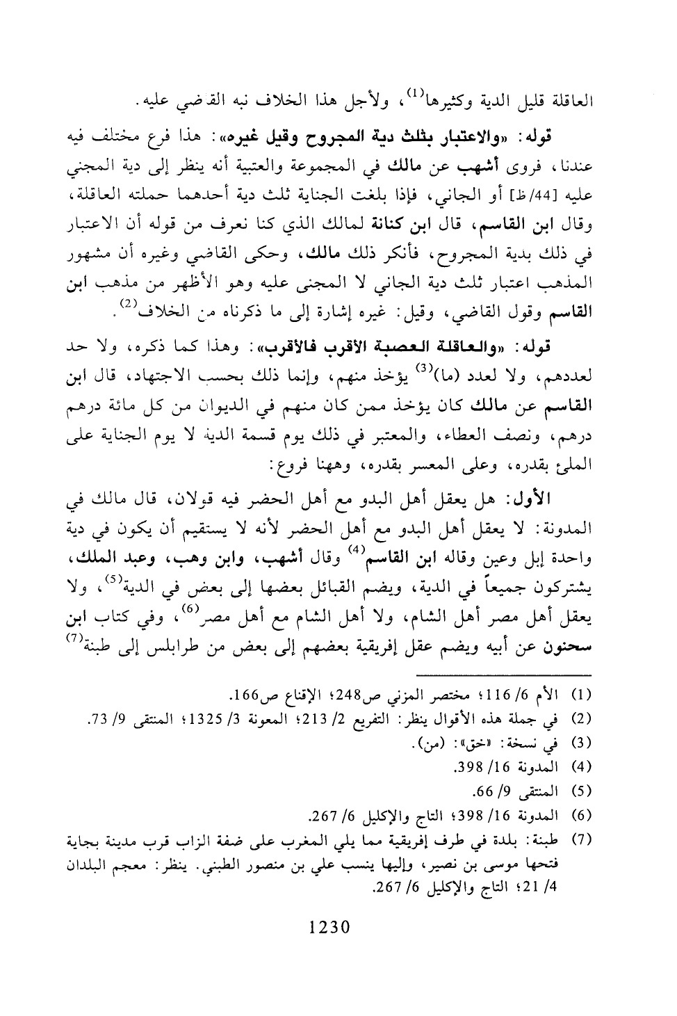 الأول: هل يعقل أهل البدو مع أهل الحضر لأنه لا يستقيم أن يكون في دية واحدة إبل وعين وقاله ابن القاسم وقال أشهب, وابن وهب, وعبد الملك, يشتركون جميعًا في الدية, ويضم القبائل بعضها إلى بعض في الدية, ولا يعقل أهل مصر أهل الشام, ولا أهل الشام مع أهل مصر, وفي كتاب ابن سحنون عن أبيه ويضم عقل إفريقية بعضهم إلى بعض من طرابلس إلى طبنة