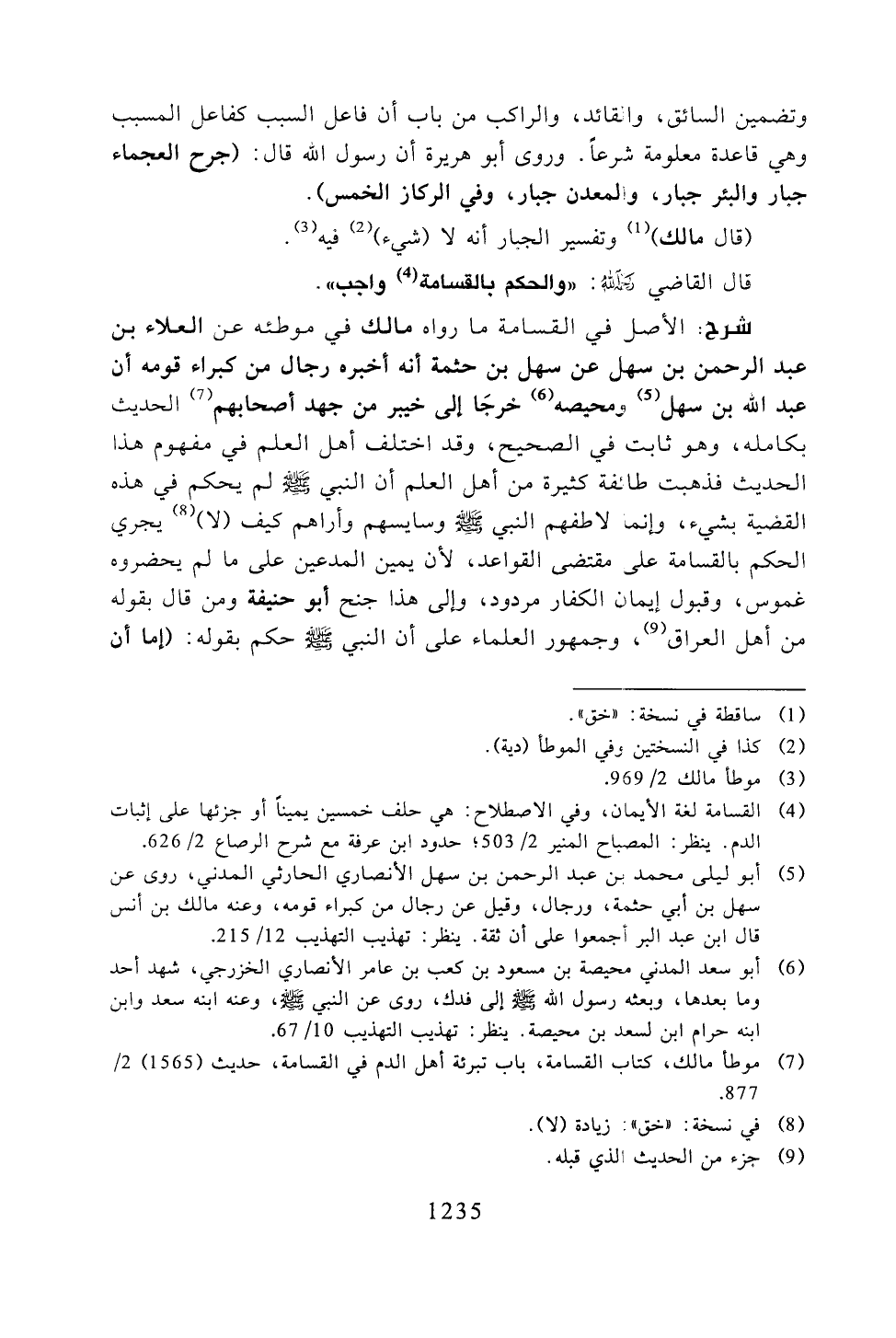 شرح: الأصل في القسامة ما رواه مالك في موطئه عن العلاء بن عبد الرحمن بن سهل عن سهل بن حثمة أنه أخبره رجال من كبراء قومه أن عبد الله بن سهل ومحيصه خرجا إلى خيبر من جهد أصحابهم الحديث بكامله، وهو ثابت فى الصحيح، وقد اختلف أهل العلم في مفهوم هذا الحديث فذهب طائفة كبيرة من أهل العلم أن النبي -صلى الله عليه وسلم- لم يحكم في هذه القضية بشيء، وإنما لاطفهم النبي -صلى الله عليه وسلم- وسايسهم وأراهم كيف (لا) يجرى الحكم بالقسامة على مقتضي القواعد، لن يمين المدعين على ما لم يحضروه غموس، وقبول إيمان الكفار مردود، وإلى هذا جنح أبو حنيفة ومن قال بقوله من أهل العراق، وجمهور العلماء على أن النبي -صلى الله عليه وسلم- حكم بقوله: (إما أن