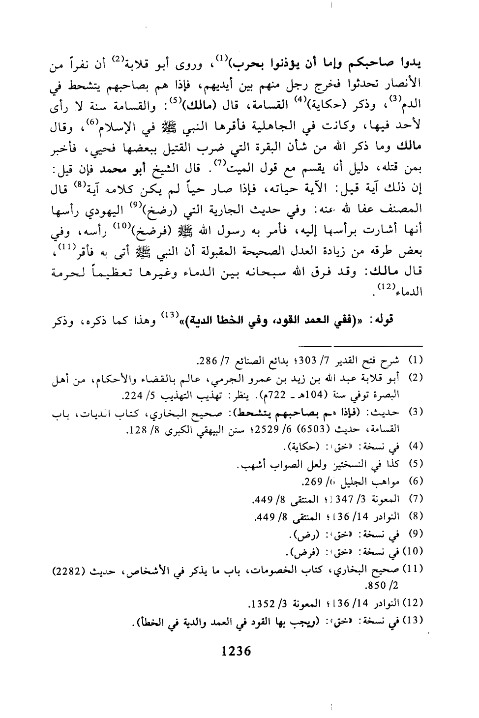 يدوا صاحبكم وإما أن يؤذنوا بحرب)، وروى أبو قلابة أن نفرا من الأنصار تحدثوا فخرج رجل منهم بين أيديهم، فإذا هم بصاحبهم يتشحط في الدم، وذكر (حكاية) القسامة، قال (مالك): والقسامة سنة لا رأي لأحد فيها، وكانت في الجاهلية فأقرها النبي -صلى الله عليه وسلم- في الإسلام، وقال مالك وما ذكر الله في شأن البقرة ضرب القتيل ببعضها فحيي، فأخبر بمن قتله، دليل أنه يقسم من قول الميت. قال الشيخ أبو محمد فإن قيل: إن ذلك آية قيل: الآية حياته، فإذا صار حيا لم يكن كلامه آية قال المصنف عفا الله عنه: وفي حديث الجارية التي (رضخ) اليهودي رأسها أنها أشارت برأسها إليه، فأمر به رسول الله -صلى الله عليه وسلم- (فرضخ) رأسه، وفي بعض طرقه من زيادة العدل الصحيحة المقبولة أن النبي -صلى الله عليه وسلم- أتى به فأقر، قال مالك: وقد فرق الله سبحانه بين الدماء وغيرها تعظيمًا لحرمة الدماء.