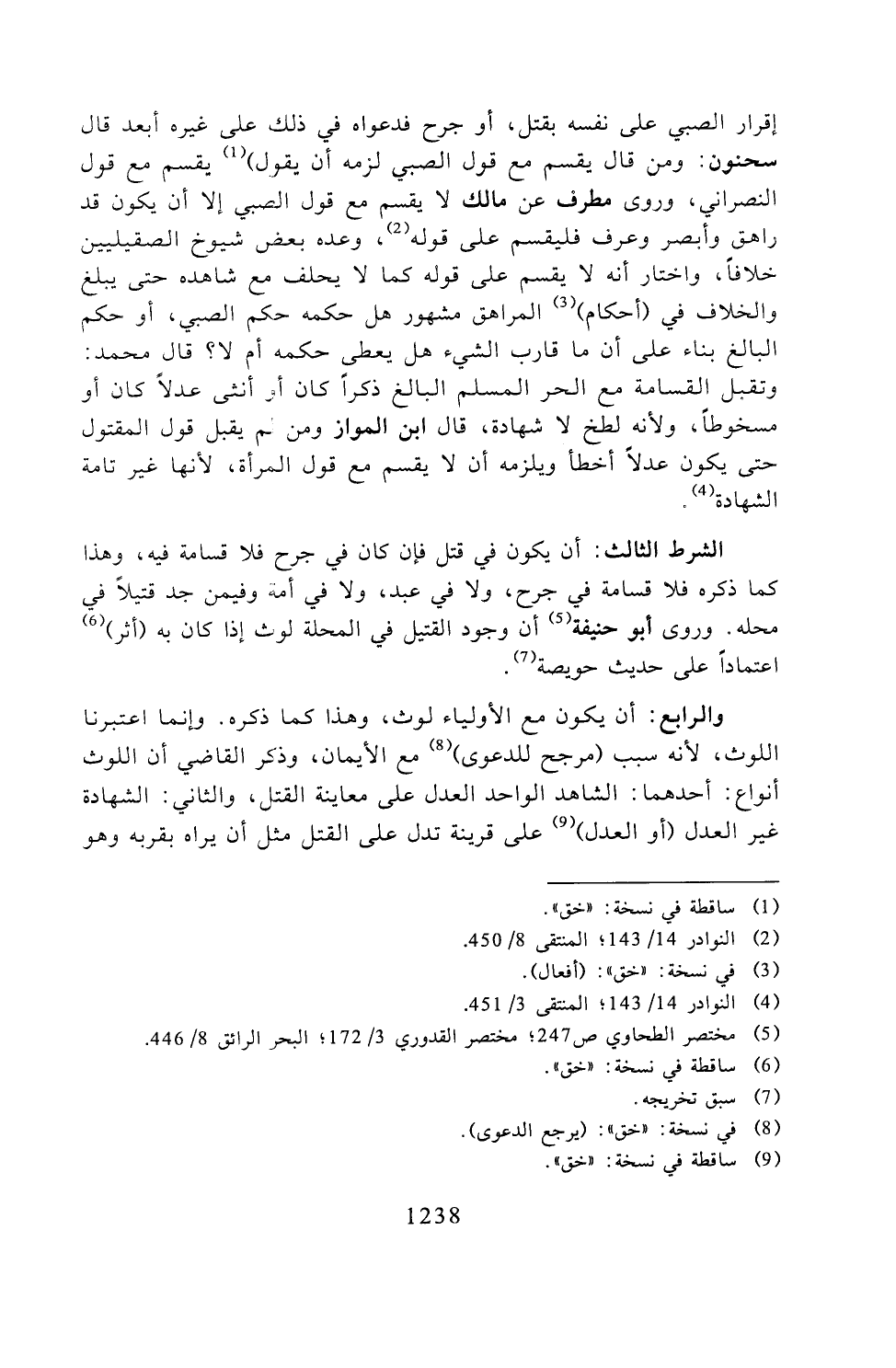 الشرط الثالث: أن يكون في قتل فإن كان في جرح فلا قسامة فيه، وهذا كما ذكره فلا قسامة في جرح، ولا في عبد، ولا في أمة وفيمن جد قتيلًا في محله. وروى أبو حنيفة أن وجود القتيل في المحلة لوث إذا كان به (أثر) اعتمادًا على حديث حويصة.