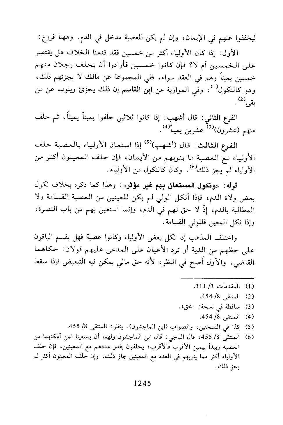 الفرع الثالث: قال (أشهب) إذا استعان الأولياء بالعصبة حلف الأولياء مع العصبة ما ينوبهم من الأيمان، فإذا حلف المعينون أكثر من الأولياء لم يجز ذلك. وكان كالنكول من الأولياء.