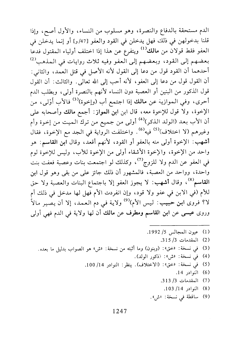 الدم مستحقة بالدفاع والنصرة، وهو مسلوب من النساء، والأول أصح، وإذا قلنا بدخولهن في ذلك فهل يدخلن في القود والعفو أو إنما يدخلن في العفو فقط قولان من مالك ويتفرع في هذا إذا اختلف أولياء المقتول فدعا بعضهم إلى القود، وبعضهم إلى العفو وفيه ثلاث روايات في المذهب أحدهما أن القود قول من دعا إلى القول لأنه الأصل في قتل العمد، والثاني: أن القول قول من دعا إلى العفو، لأنه أحب إلى الله تعالى. والثالث: أن القول قول الذكور من البنين أو العصبة دون النساء لأنهم بالنصرة أولى، وبطلب الدم أحرى، وفي الموازية عن مالك إذا اجتمع أب (وإخوة) فالأب أولى، من الإخوة، ولا قول للإخوة معه، قال ابن ابن المواز: أجمع مالك وأصحابه على أن الأب بعد (الولد الذكر) أولى من جميع من ترك الميت من إخوة وأم وغيرهم (لا اختلاف) فيه. واختلفت الرواية مع الجد والإخوة، فقال أشهب: الإخوة أولى منه بالعفو أو القود، لأنهم أقعد، وقال ابن القاسم: هو واحد من الإخوة، والإخوة الأشقاء أولى من الإخوة للأب، وليس للإخوة لوم في العفو عن الدم ولا للزوج، وكذلك لو اجتمعت بنات وعصبة فعفت بنت واحدة، وواحد من العصبة، فالمشهور أن ذلك جائز على من بقى وهو قول ابن القاسم، وقال أشهب: لا يجوز العفو إلا باجتماع البنات والعصبة ولا حق للأم (في الابن في عفو ولا قود، وإن انفردت الأم فهل لها مدخل في ذلك أم لا؟ فروى ابن حبيب: ليس الأم) ولاية في دم العمد، إلا أن يصير مالًا وروى عيسى عن ابن القاسم ومطرف عن مالك أن لها ولاية في الدم فهي أولى