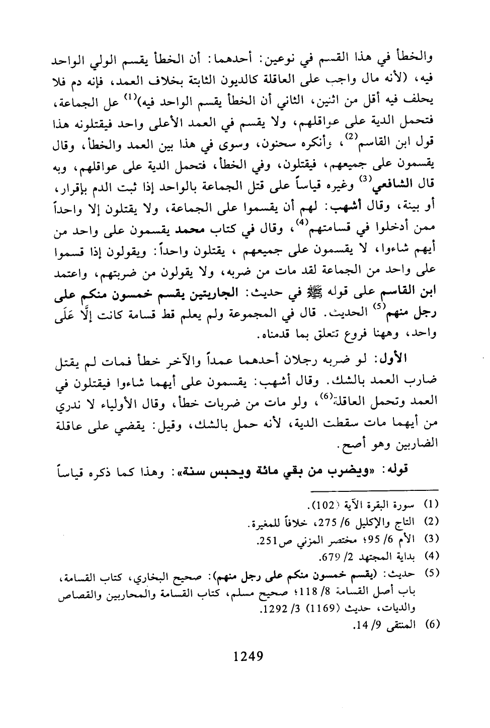والخطأ في هذا القسم في نوعين: أحدهما: أن الخطأ يقسم الولي الواحد فيه، (لأنه مال واجب على العاقلة كالديون الثابتة بخلاف العمد، فإنه دم فلا يحلف فيه أقل من اثنين، الثاني أن الخطأ يقسم الواحد فيه) على الجماعة، فتحمل الدية على عواقلهم، ولا يقسم في العمد الأعلى واحد فيقتلونه هذا قول ابن القاسم، وأنكره سحنون، وسوى في هذا بين العمد والخطأ، وقال يقسمون على جميعهم، فيقتلون، وفي الخطأ، فتحمل الدية على عواقلهم، وبه قال الشافعي وغيره قياسًا على قتل الجماعة بالواحد إذا ثبت الدم بإقرار، أو بينه، وقال أشهب: لهم أن يقسموا على الجماعة، ولا يقتلون إلا واحدًا ممن أدخلوا في قسامتهم، وقال في كتاب محمد يقسمون على واحد من أيهم شاءوا، لا يقسمون على جميعهم، يقتلون واحدًا: ويقولون إذا قسموا على واحد من الجماعة لقد مات من ضربه، ولا يقولون من ضربتهم، واعتمد ابن القاسم على قوله -صلى الله عليه وسلم- في حديث: الجاريتين يقسم خمسون منكم على رجل منهم الحديث. قال في المجموعة ولم يعلم قط قسامة كانت إلا على واحد، وههنا فروع تتعلق بما قدمناه.