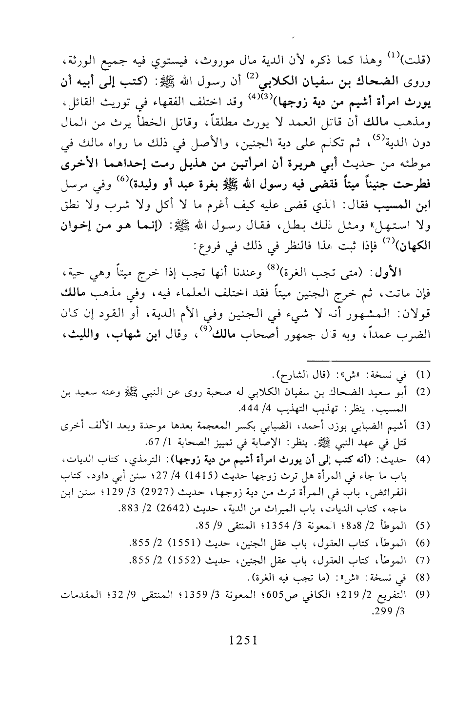 (قلت) وهذا كما ذكره لأن الدية مال موروث، فيستوي فيه جميع الورثة، وروى الضحاك بن سفيان الكلابي أن رسول الله -صلى الله عليه وسلم-: (كب إلى أبيه أن يورث امرأة أشيم من دية زوجها) وقد اختلف الفقهاء في توريث القائل، ومذهب مالك أن قاتل العمد لا يورث مطلقًا، وقاتل الخطأ يرث من المال دون الدية، ثم تكلم على دية الجنين، والأصل في ذلك ما رواه مالك في موطئه من حديث أبي هريرة أم امرأتين من هذيل رمت إحداهما الأخرى فطرحت جنينًا ميتًا فقضى فيه رسول الله -صلى الله عليه وسلم- بغرة عبد أو وليدة) وفي مرسل ابن المسيب فقال: الذي قضى عليه كيف أغرم ما لا أكل ولا شرب ولا نطق ولا استهل)) ومثل ذلك بطل، فقال رسول الله -صلى الله عليه وسلم-: (إنما هو من إخوان الكهان) فإذا ثبت هذا فالنظر في ذلك في فروع: