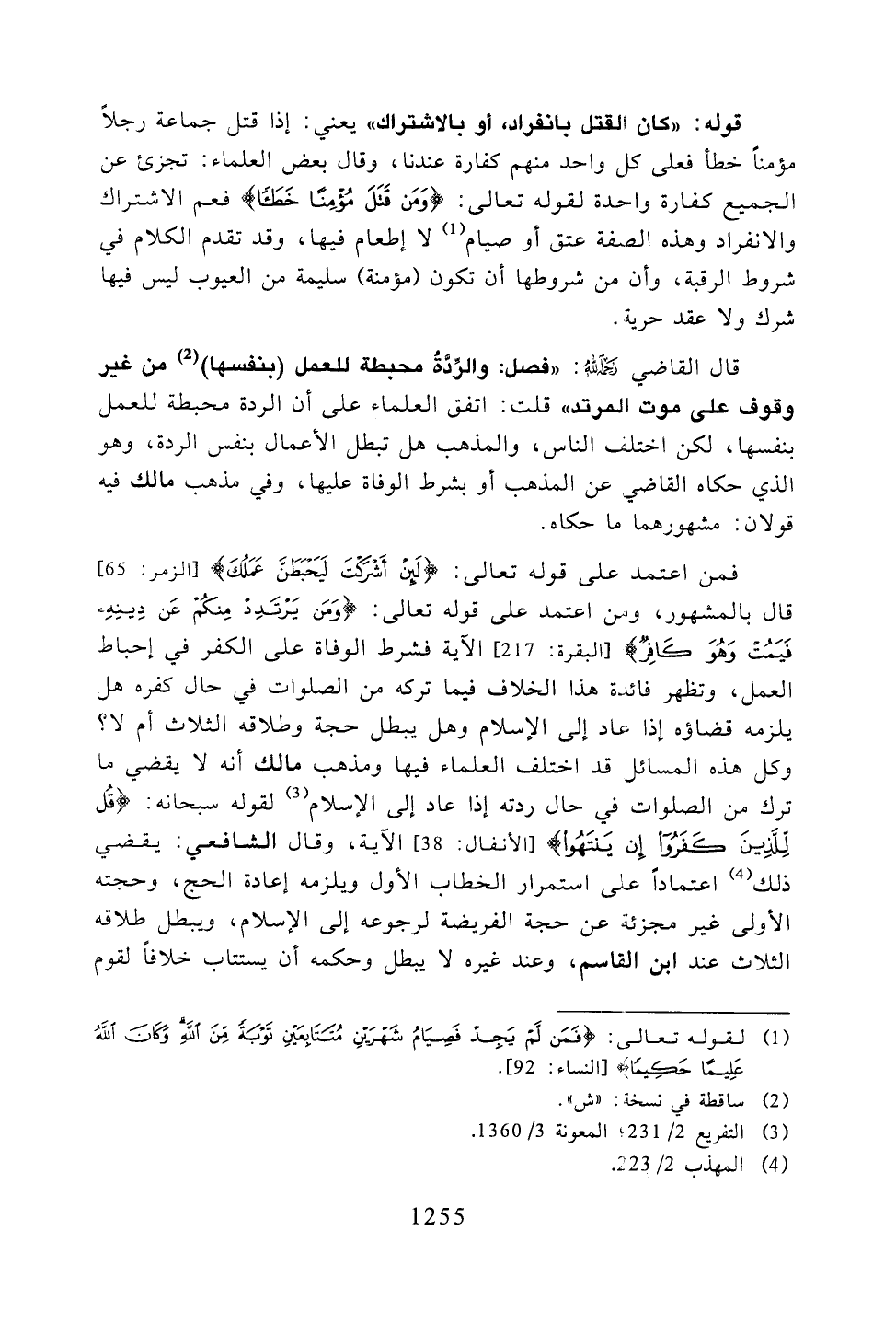 فمن اعتمد على قوله تعالى:} لئن أشركت ليحبطن عملك {قال بالمشهور، ومن اعتمد على قوله تعالى:} ومن يرتد منكم عن دينه فيمت وهو كافر {الآية فشرط الوفاة على الكفر في إحباط العمل، وتظهر فائدة هذا الخلاف فيما تركه من الصلوات في حال كفره هل يلزمه قضاؤه إذا عاد إلى الإسلام وهل يبطل حجة وطلاقه الثلاث أم لا؟ وكل هذه المسائل قد اختلف العلماء فيها ومذهب مالك أنه لا يقضي ما ترك من الصلوات في حال ردته إذا عاد إلى الإسلام لقوله سبحانه:} قل للذين كفروا إن ينتهوا {الآية، وقال الشافعي: يقضي ذلك اعتمادًا على استمرار الخطاب الأول ويلزمه إعادة الحج، وحجته الأولى غير مجزئة عن حجة الفريضة لرجوعه إلى الإسلام، ويبطل طلاقه الثلاث عند ابن القاسم، وعند غيره لا يبطل وحكمه أن يستتاب خلافًا لقوم