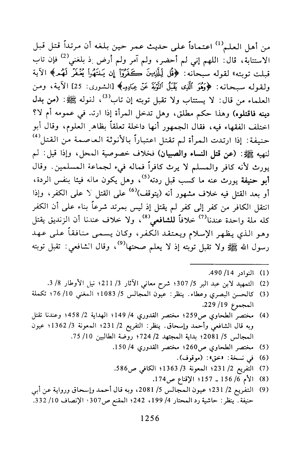 من أهل العلم اعتمادًا على حديث عمر حين بلغه أن مرتدًا قتل قبل الاستتابة، قال: اللهم إني لم أحضر، ولم أمر ولم أرض إذ بلغني فإن تاب قبلت توبته)) لقوله سبحانه:} قل للذين كفروا إن ينتهوا يغفر لهم {الآية ولقوله سبحانه:} وهو الذي يقبل التوبة عن عباده {الآية، ومن العلماء من قال: لا يستتاب ولا تقبل توبته إن تاب، لقوله -صلى الله عليه وسلم-: (من بدل دينه فاقتلوه) وهذا حكم مطلق، وهل تدخل المرأة إذا ارتد في عمومه أم لا؟ اختلف الفقهاء فيه، فقال الجمهور أنها داخلة تعلقًا بظاهر العلوم، وقال أبو حنيفة: إذا ارتدت المرأة لم تقتل اعتبارًا من الأنوثة العاصمة من القتل لنهيه -صلى الله عليه وسلم-: (عن قتل النساء والصبيان) فخلاف خصوصية المحل، وإذا قيل: لم يورث لأنه كافر والمسلم لا يرث كافرًا فماله فيء لجماعة المسلمين. وقال أبو حنيفة يورث عنه ما كسب قبل ردته، وهل يكون ماله فيئا بنفس الردة، أو بعد القتل فيه خلاف مشهور أنه (يتوقف) على القتل لا على الكفر، وإذا انتقل الكافر من كفر إلى كفر لم يقتل إذ ليس بمرتد شرعًا بناء على أن الكفر كله ملة واحدة عندنا خلافًا للشافعي، ولا خلاف عندنا أن الزنديق يقتل وهو الذي يظهر الإسلام ويعتقد الكفر، وكان يسمى منافقًا على عهد رسول الله -صلى الله عليه وسلم- ولا تقبل توبته إذ لا يعلم صحتها، وقال الشافعي: تقبل توبته