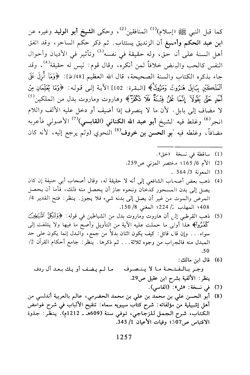 كما قبل النبي -صلى الله عليه وسلم- (إسلام) المنافقين، وحكى الشيخ أبو الوليد وغيره عن ابن عبد الحكم وأصبغ أن الزنديق يستتاب. ثم ذك حكم الساحر، وقد اتفق أهل السنة على أنه حق، وله حقيقة في نفسه وتأثير في الأديان وأحوال النفس كالحب والبغض خلافًا لمن أنكره، وقال قوم: ليس له حقيقة، وقد جاء بذكره الكتاب والسنة الصحيحة، قال الله العظيم:} وما أنزل على الملكين ببابل هاروت وماروت {الآية إلى قوله:} وما يعلمان من أحد حتى يقولا إنما نحن فتنة فلا تكفر {وهاروت وماروت بدل من الملكين لا مضاف إلى بابل، لأن ما لا ينصرف إذا أضيف أو دخل عليه الألف واللام انجر وغلظ فيه الشيخ أبو عبد الله الكناني (القابسي) الأصولي فأعربه مضافًا، وغلظ فيه أبو الحسن بنخروف النحوي (ولم يرجع إليه، لأنه كان