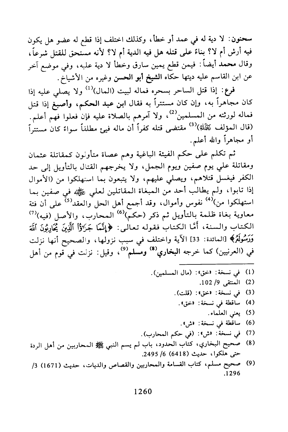 ثم تكلم على حكم الفيئة الباغية وهم عصاة متأولون كمقاتلة عثمان ومقاتلة علي يوم صفين ويوم الجمل، ولا يخرجهم القتال بالتأويل إلى حد الكفر فيغسل قتلاهم، ويصلي عليهم، ولا يتبعون بما استهلكوا من (الأموال إذا تابوا، ولم يطالب أحد من المبغاة المقاتلين لعلي -رضي الله عنه- في صفين بما استهلكوا من) نفوس وأموال، وقد أجمع أهل الحل والعقد على أن فئة معاوية بغاة ظلمة بالتأويل ثم ذكر (حكم) المحارب، والأصل (فيه) الكتاب والسنة، أما الكتاب فقوله تعالى:} إنما جزاء اللذين يحاربون الله ورسوله {الآية واختلف في سبب نزولها، والصحيح أنها نزلت في (العرنيين) كما خرجه البخاري ومسلم، وقيل: نزلت في قوم من أهل