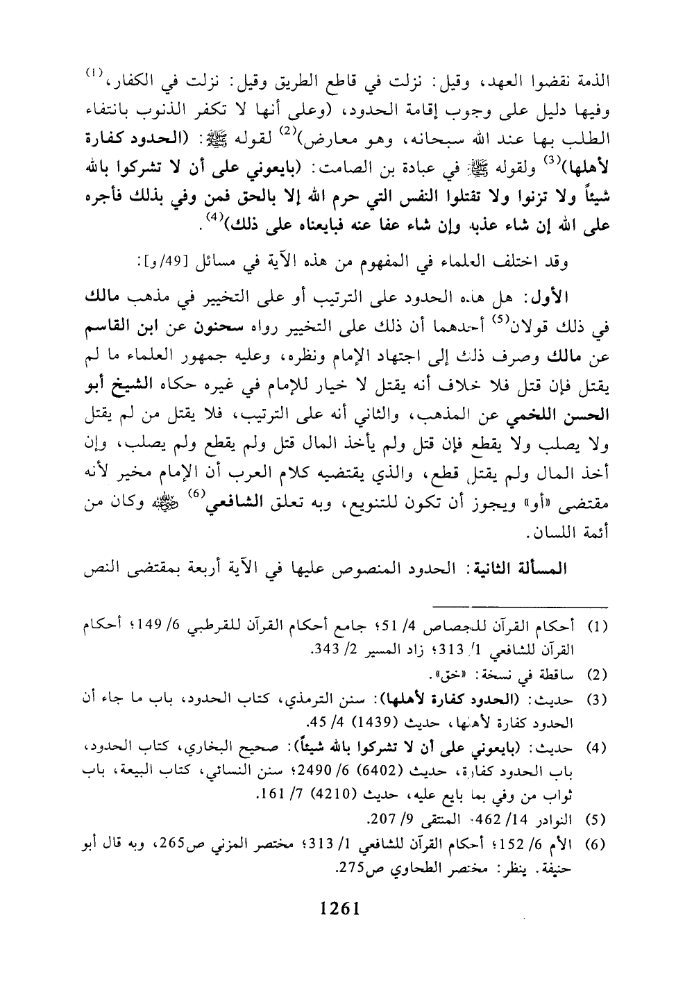 الأول: هل هذه الحدود على الترتيب أو على التخيير في مذهب مالك في ذلك قولان أحدهما أن ذلك على التخيير رواه سحنون عن ابن القاسم عن مالك وصرف ذلك إلى اجتهاد الإمام ونظره، وعليه جمهور العلماء ما لم يقتل فإن قتل فلا خلاف أنه يقتل لا خيار للإمام في في غيره حكاه الشيخ أبو الحسن اللخمي عن المذهب، والثاني أنه على الترتيب، فلا يقتل من لم يقتل ولا يصلب ولا يقطع فإن قتل ولم يأخذ المال قتل ولم يقطع ولم يصلب، وإن أخذ المال ولم يقتل قطع، والذي يقتضيه كلام العرب أن الإمام مخير لأنه مقتضى ((أو)) ويجوز أن تكون للتنويع، وبه تعلق الشافعي -رضي الله عنه- وكان من أئمة اللسان.