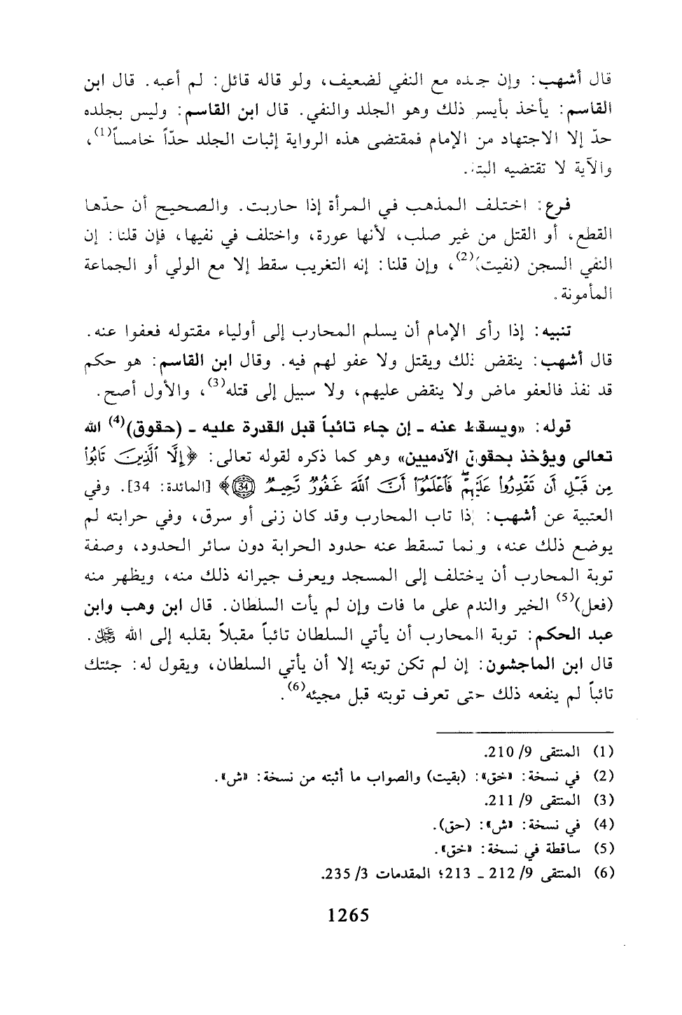 قوله: "ويسقط عنه - إن جاء تائبًا قبل القدرة عليه - (حقوق) الله تعالى ويؤخذ بحقوق الآدميين" وهو كما ذكره لقوله تعالى: {إلا الذين تابوا من قبل أن تقدروا عليهم فاعلموا أن الله غفور رحيم *} [المائدة: 34]. وفي العتبية عن أشهب: إذا تاب المحارب وقد كان زنى أو سرق، وفي حرابته لم يوضع ذلك عنه، وإنما تسقط عنه حدود الحرابة دون سائر الحدود، وصفة توبة المحارب أن يختلف إلى المسجد ويعرف جيرانه ذلك منه، ويظهر منه (فعل) الخير والندم على ما فات وإن لم يأت السلطان. قال ابن وهب وابن عبد الحكم: توبة المحارب أن يأتي السلطان تائبًا مقبلًا بقلبه إلى الله -عز وجل-. قال ابن الماجشون: إن لم تكن توبته إلا أن يأتي السلطان، ويقول له: جئتك تائبًا لم ينفعه ذلك حتى تعرف توبته قبل مجيئه.