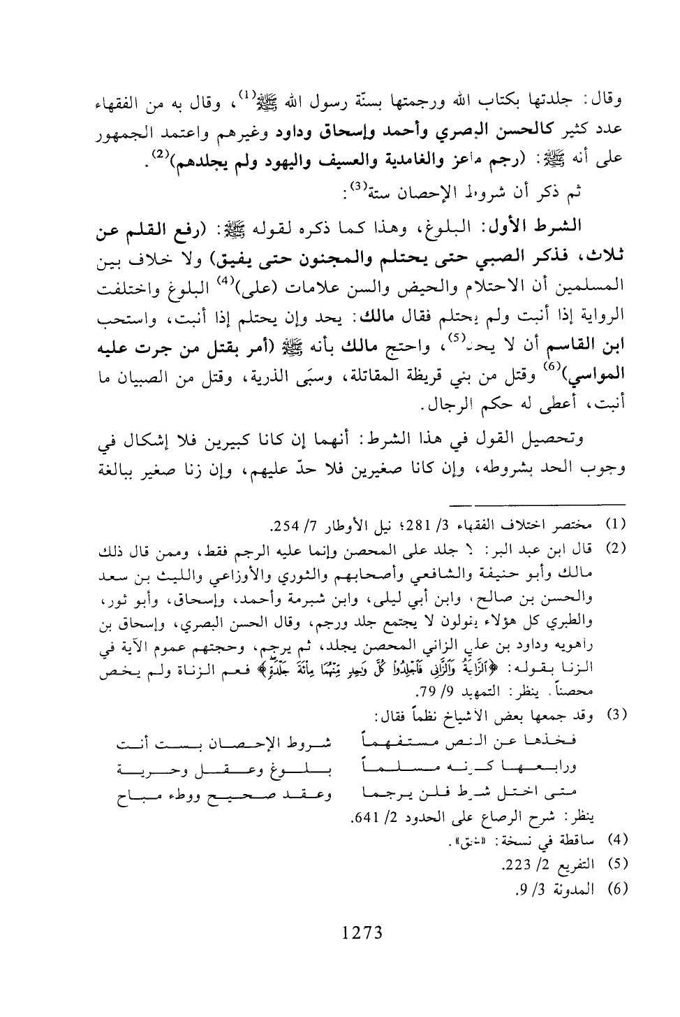 الشرط الأول: البلوغ، وهذا كما ذكره لقوله -صلى الله عليه وسلم-، (رفع القلم عن ثلاث، فذكر الصبي حتى يحتلم والمجنون حتى يفيق) ولا خلاف بين المسلمين أن الاحتلام والحيض والسن علامات (على) البلوغ واختلفت الرواية إذا أنبت ولم يحتلم فقال مالك: يحد وإن يحتلم إذا أنبت، واستحب ابن القاسم أن لا يحد، واحتج مالك بأنه -صلى الله عليه وسلم- (أمر بقتل من جرت عليه المواسي) وقتل من بني قريظة المقاتلة، وسبى الذرية، وقتل من الصبيان ما أنبت، أعطى له حكم الرجال.