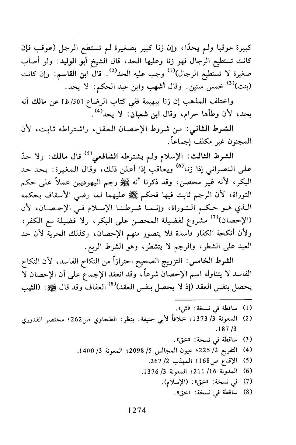 الشرط الخامس: التزويج الصحيح احترازًا من النكاح الفاسد، لأن النكاح الفاسد لا يتناوله اسم الإحصان شرعًا، وقد انعقد الإجماع على أن الإحصان لا يحصل بنفس العقد (إذ لا يحصل بنفس العقد) العفاف وقد قال -صلى الله عليه وسلم-: (الثيب