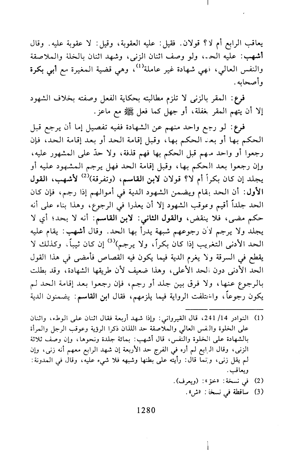 يعاقب الرابع أم لا؟ قولان. فقيل: عليه العقوبة، وقيل: لا عقوبة عليه. وقال أشهب: عليه الحد، ولو وصف اثنان الزنا، وشهد اثنان بالخلة والملاصقة والنفس العالي، فهي شهادة غير عاملة، وهي قضية المغيرة مع أبي بكرة وأصحابه.